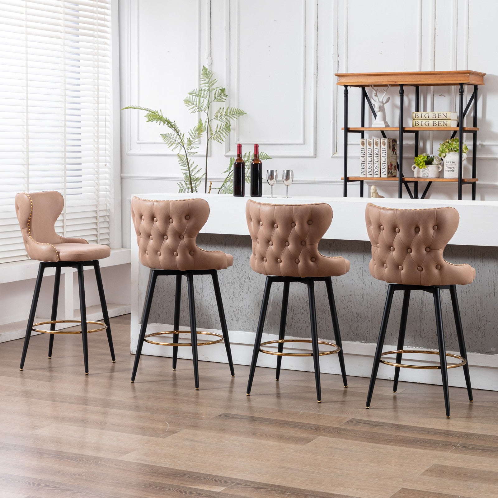 Thickened leather fabric; 180 ° rotation and self centering Gold nail head; Black metal legs with gold foot pads and toes; Easy to assemble;
