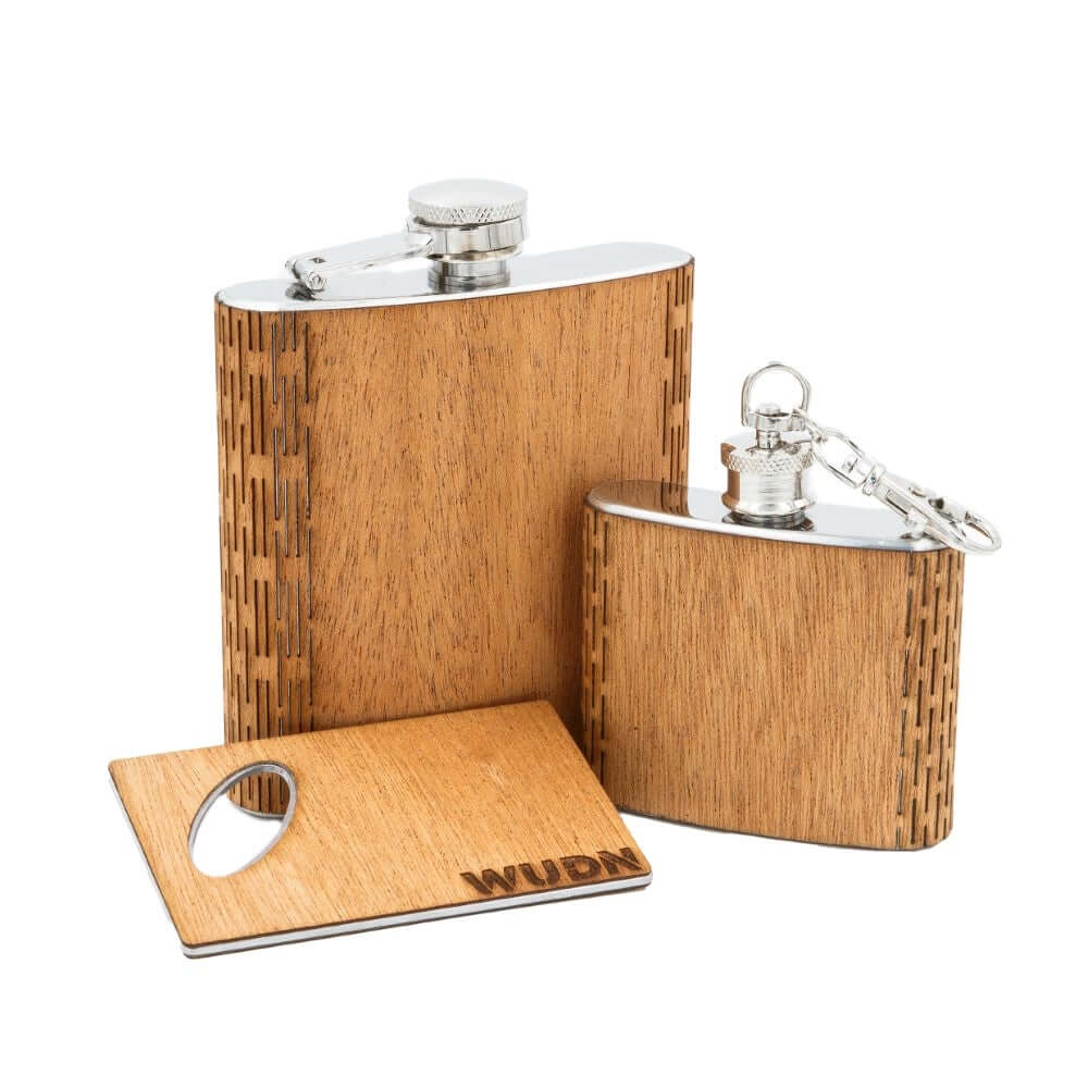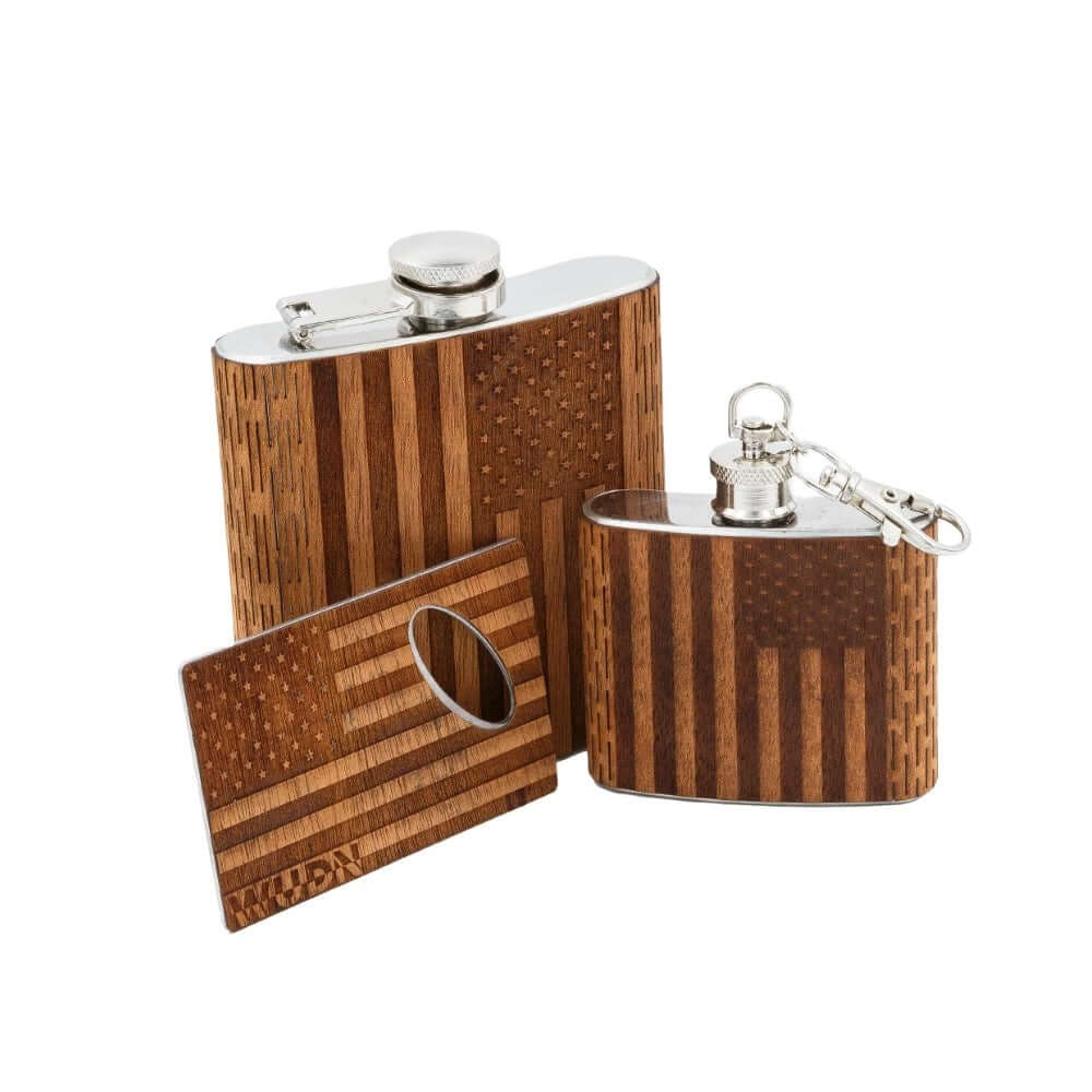 3-Piece Wooden Flask Set (6 oz. Hip Flask, 2 oz. Keychain Flask, Credit Card Bottle Opener)