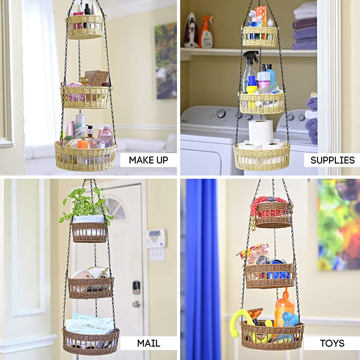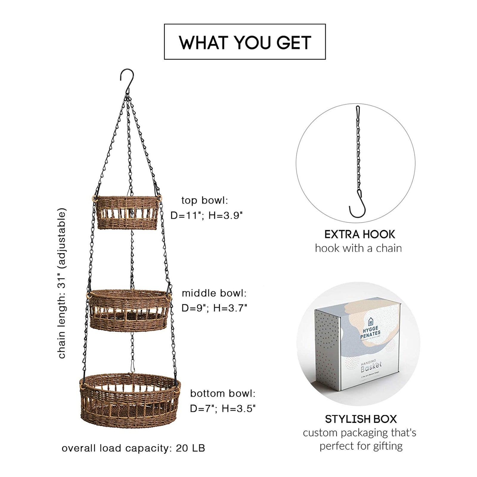 3 Tier Hanging Fruit Basket Wicker Vegetable Storage And Fruit Organizer With Banana Holder