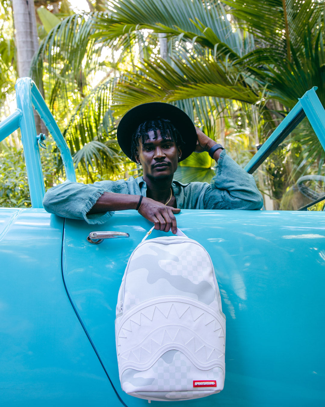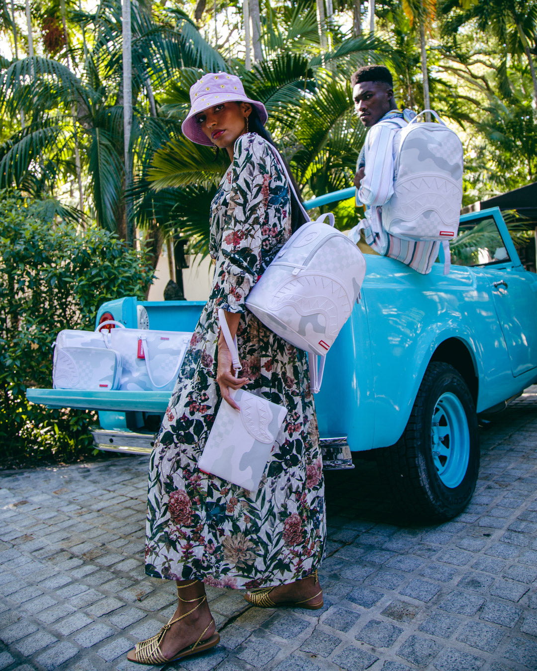 Dimensions: 18" x 6" x 11.5" • Front zipper pocket • Side pockets • Zippered Stash pocket • Separate velour sunglass compartment • Ergonomic mesh back padding • Adjustable Straps for custom sizing • Gold zippers with metal hardware • Metal "Sprayground Authentic" badge • Slide through back sleeve connects to carry-on luggage to free your hands