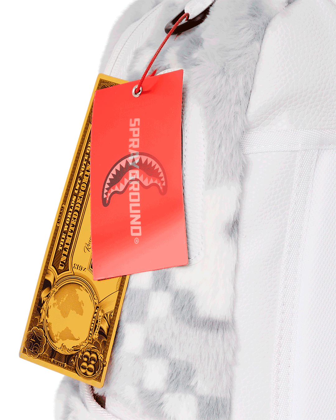 Dimensions: 18" x 6" x 11.5" • Front zipper pocket • Side pockets • Zippered Stash pocket • Separate velour sunglass compartment • Ergonomic mesh back padding • Adjustable Straps for custom sizing • Gold zippers with metal hardware • Metal "Sprayground Authentic" badge • Slide through back sleeve connects to carry-on luggage to free your hands