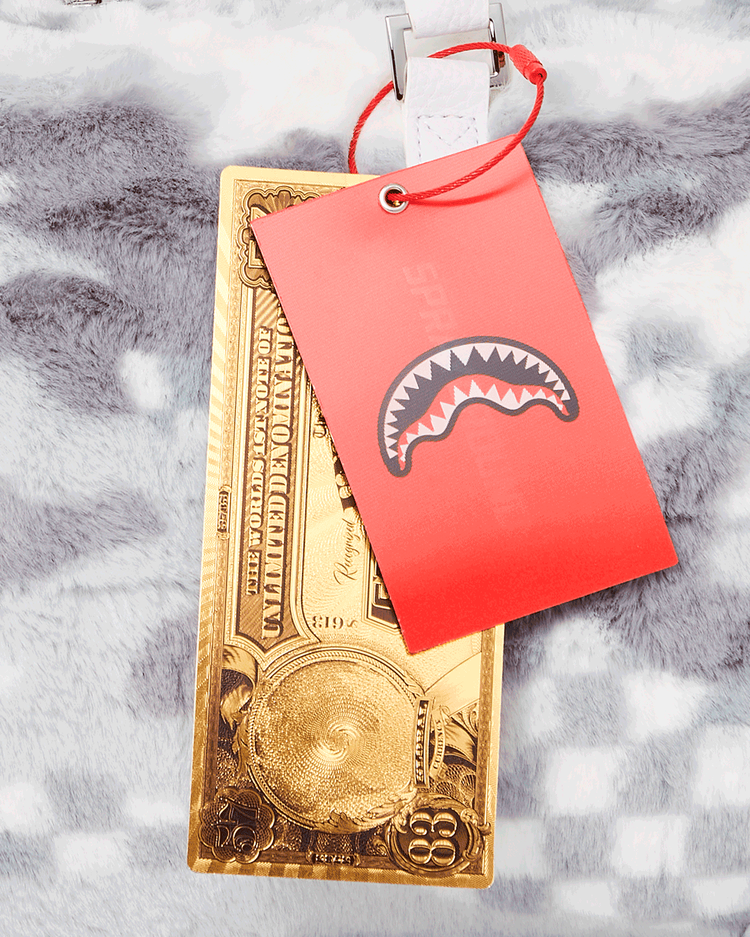 Dimensions: 8" x 7.5" x 13"• Metal zipper pocket• Back Zippers •Zippered sneaker pocket • gold zippers • Adjustable Straps for custom sizing •Metal Zippers with Metal Hardware • bag of Sprayground money