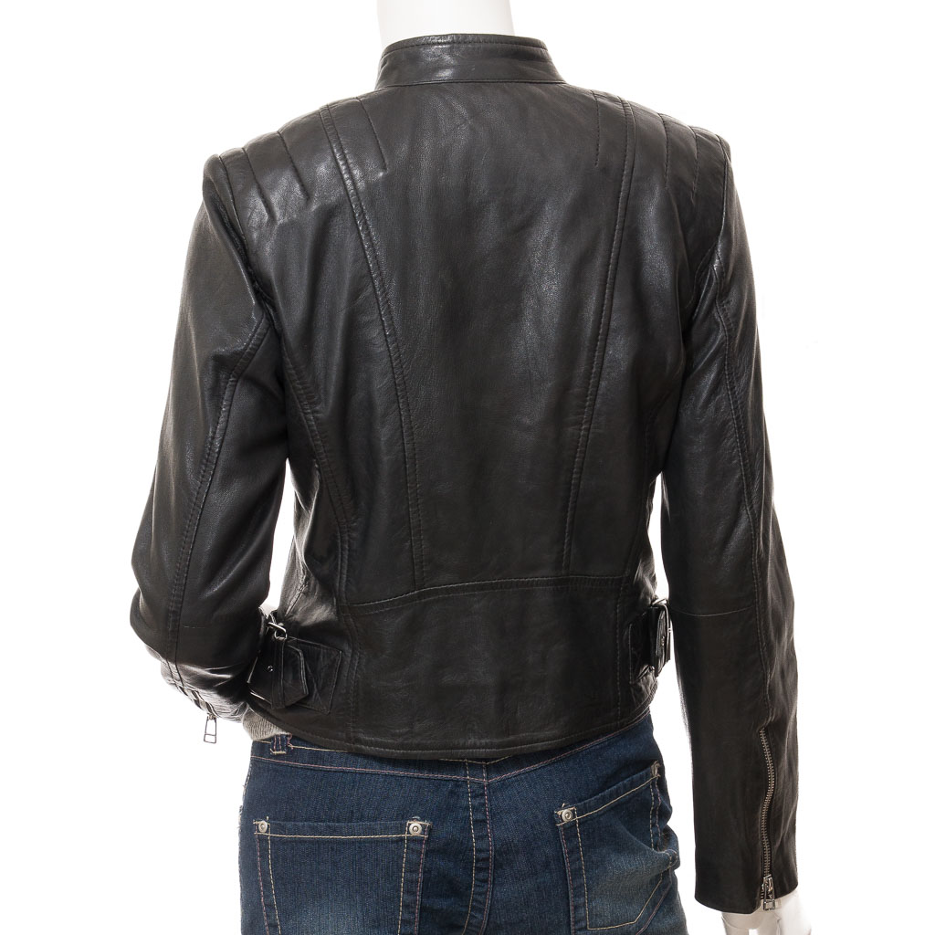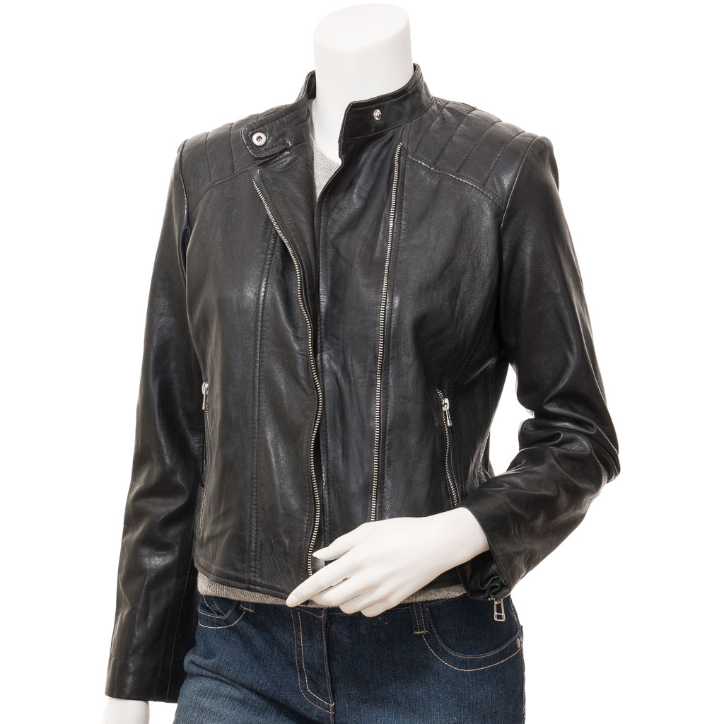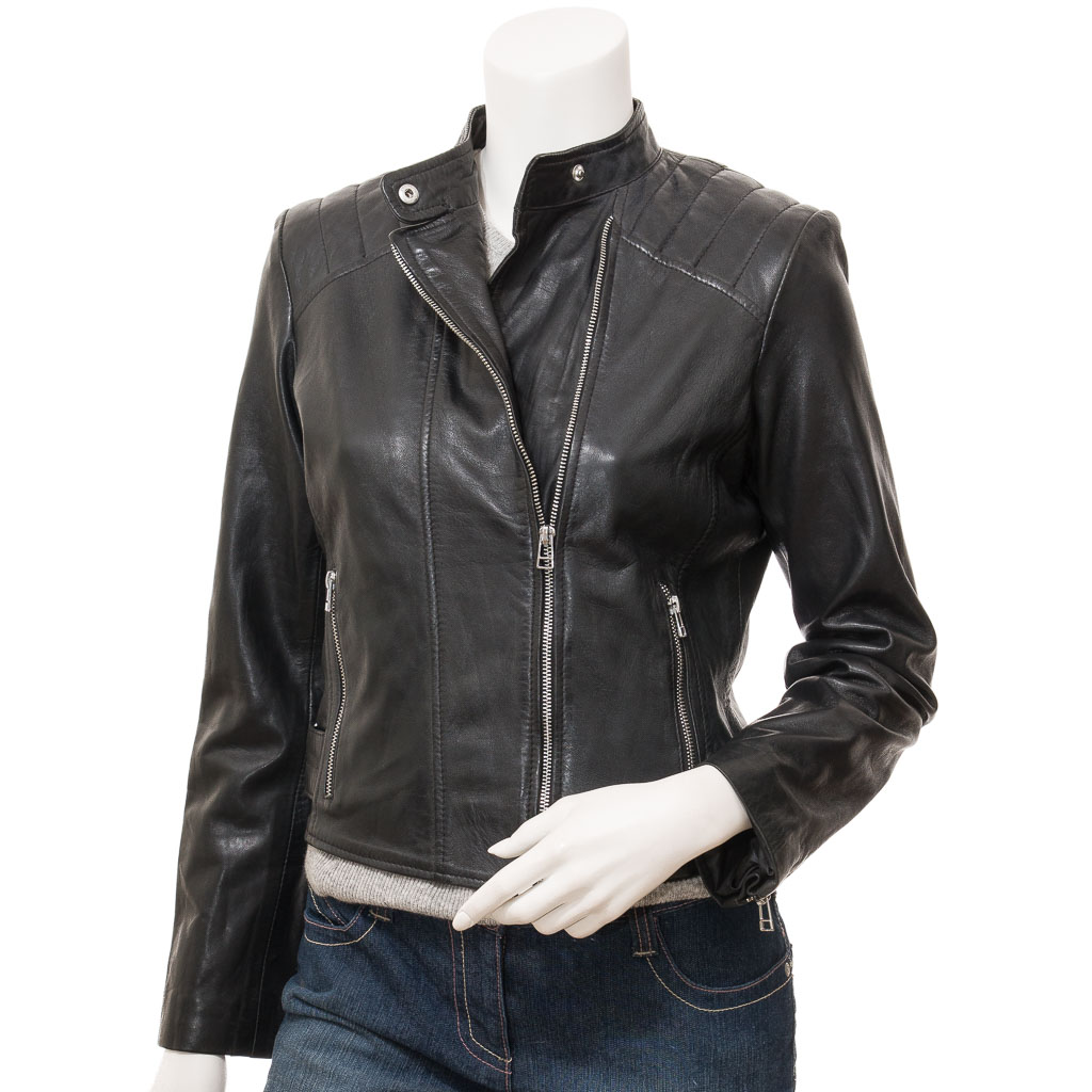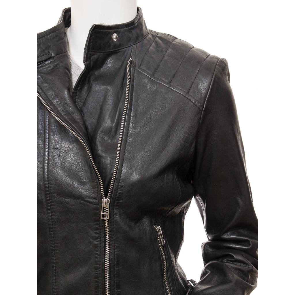 WOMEN'S BLACK LEATHER BIKER JACKET: DELTONA