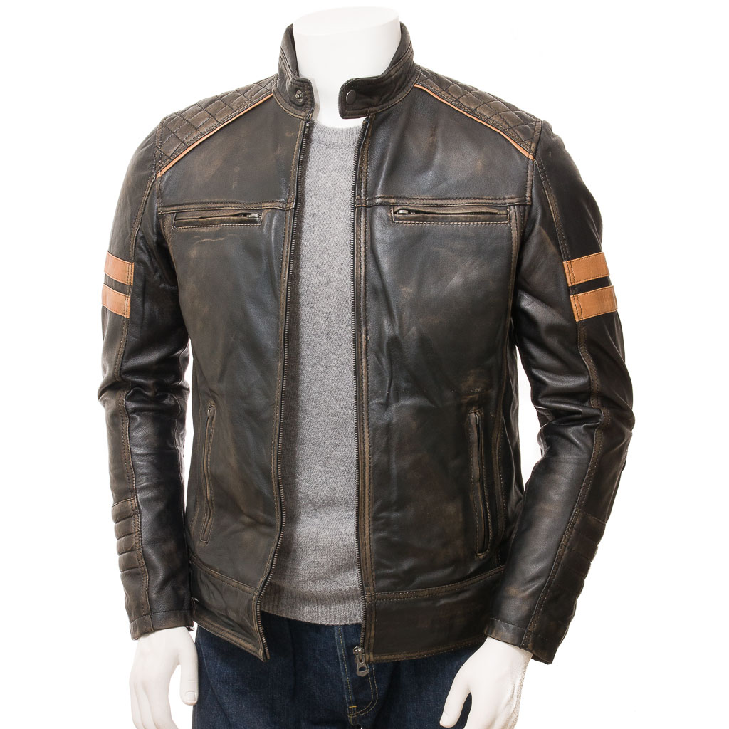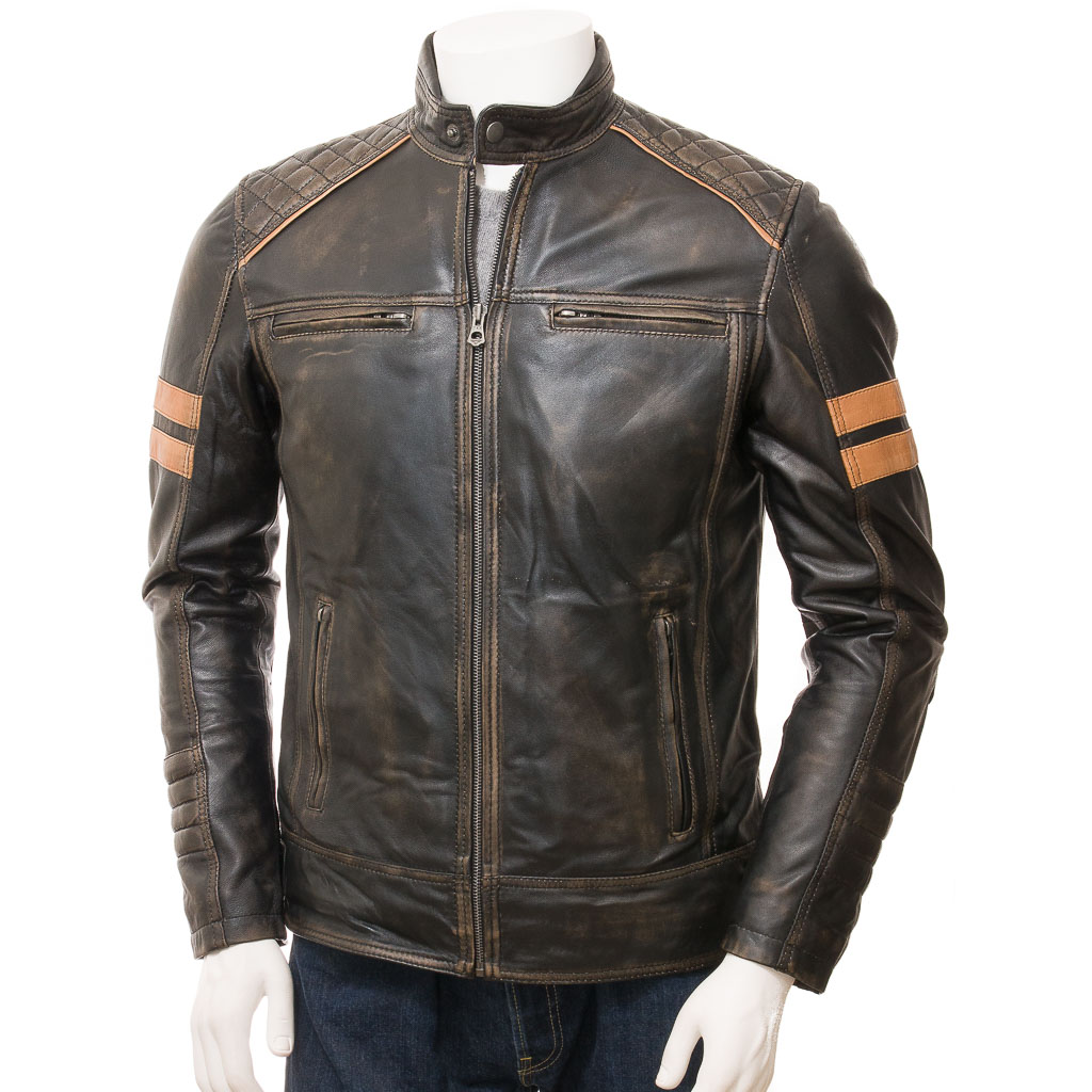A superb, retro inspired cafe racer leather biker jacket in a vintage colourway.