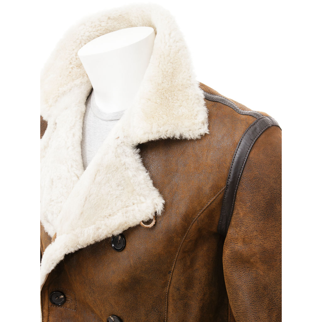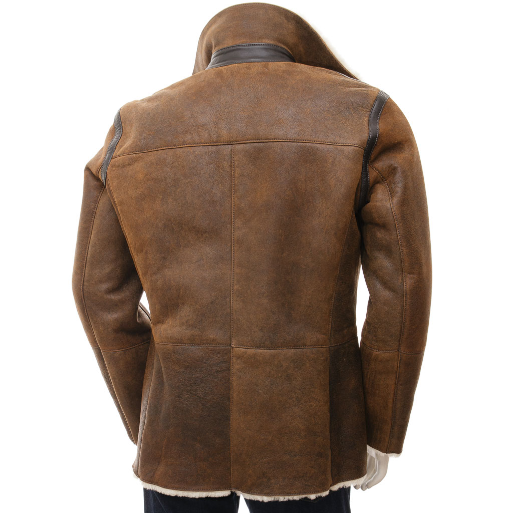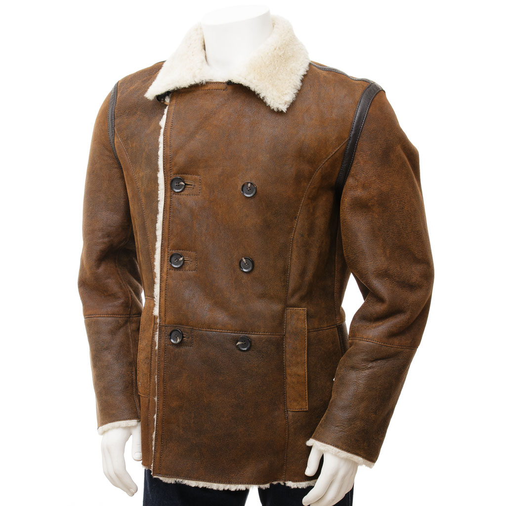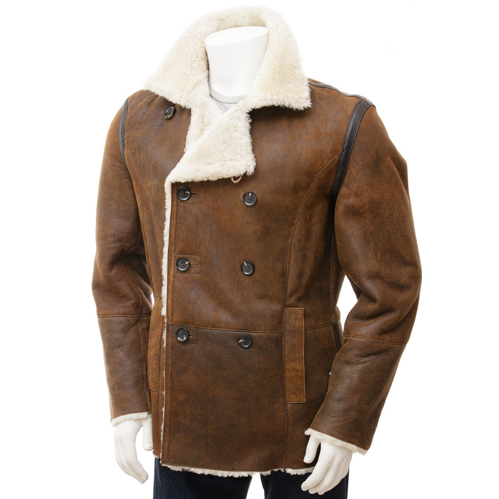 MEN'S TAN SHEEPSKIN SHEARLING PEACOAT: GRAFTON