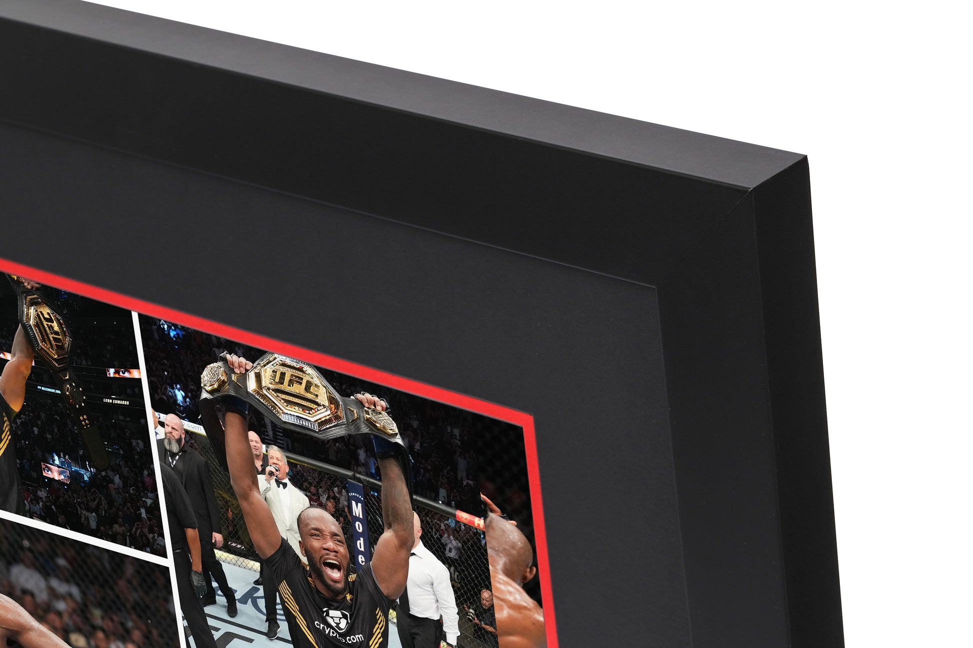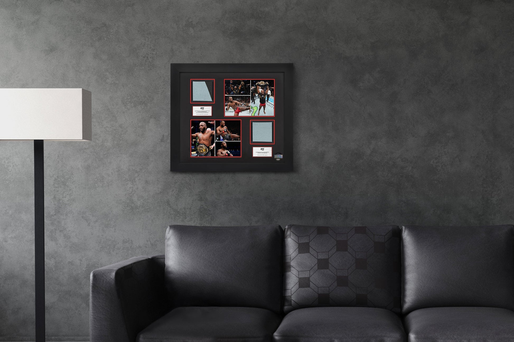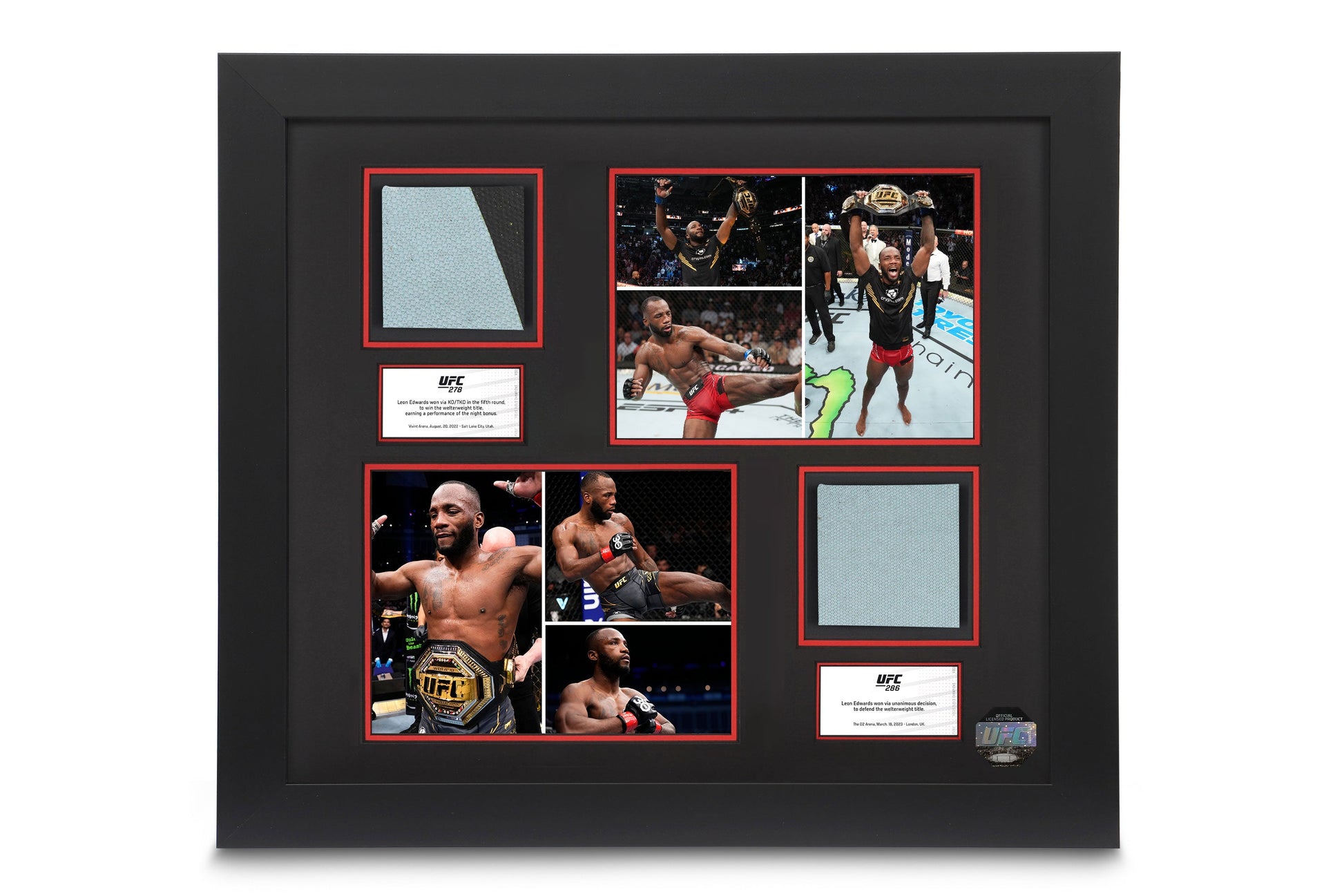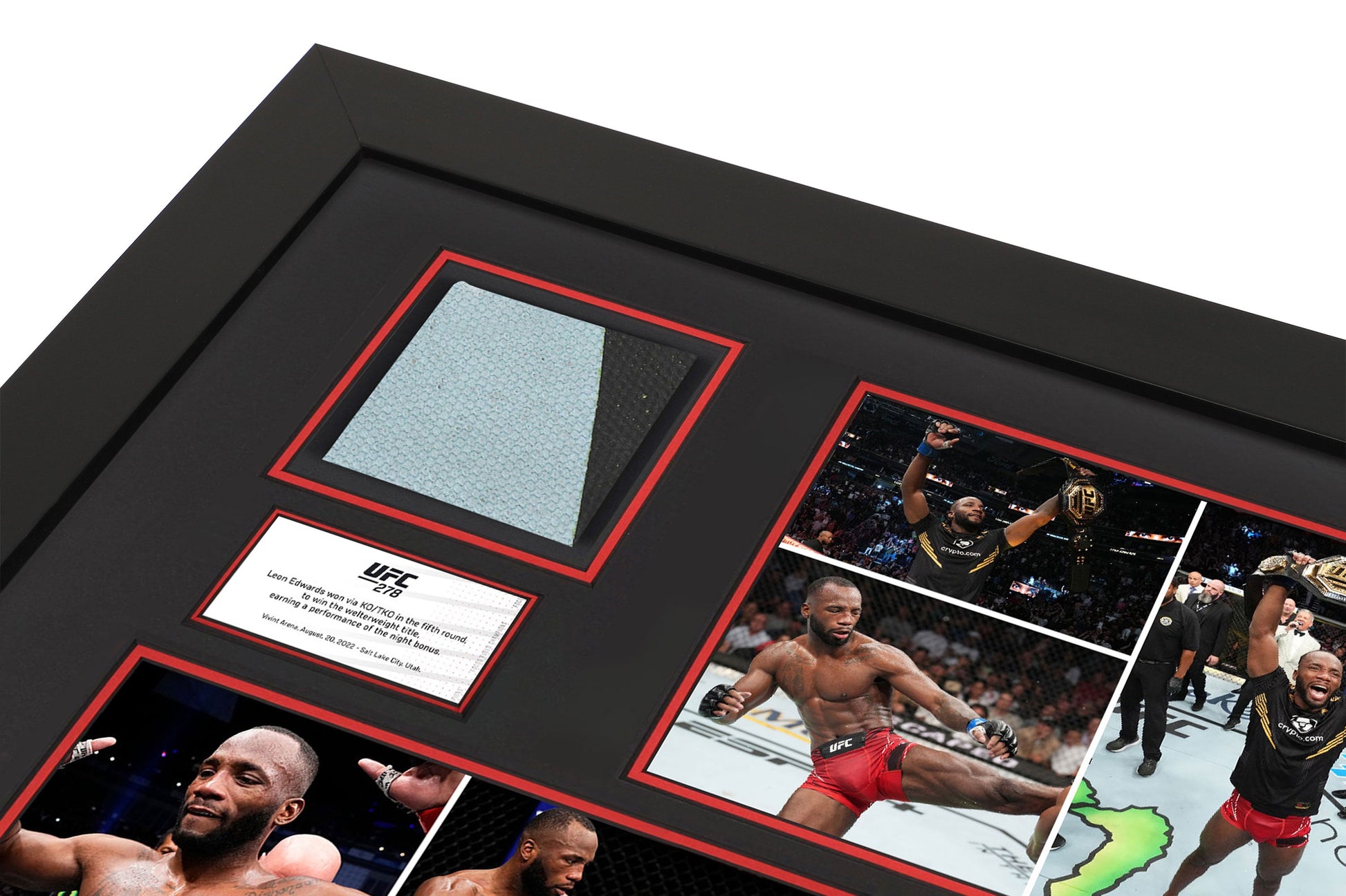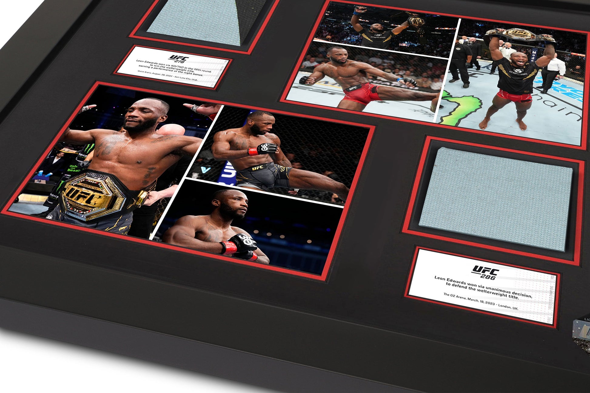 This special limited-edition display features event used canvas from the genuine canvases that lined the Octagon for both these monumental events. Fought on not only by Edwards and Usman, but all other athletes who took part in both events. The canvases are presented alongside a collage of photos from the events, so you can truly relive the exciting moment Edwards claimed and retained his belt.