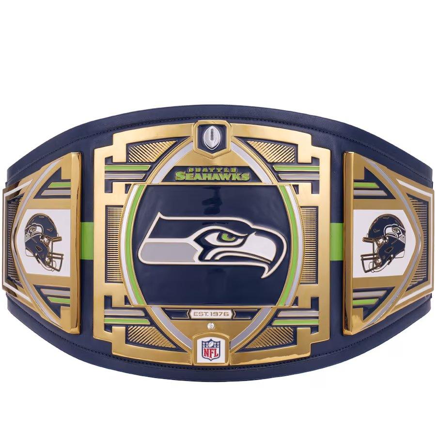 Championship Belt is a masterpiece that embodies the fierce spirit of the 12th Man. Crafted with meticulous care, it pays tribute to a franchise that has revolutionized the game. The centerpiece prominently displays the iconic Seahawks logo, proudly embossed against a backdrop of striking blue and green, reminiscent of the roaring waves of CenturyLink Field. This