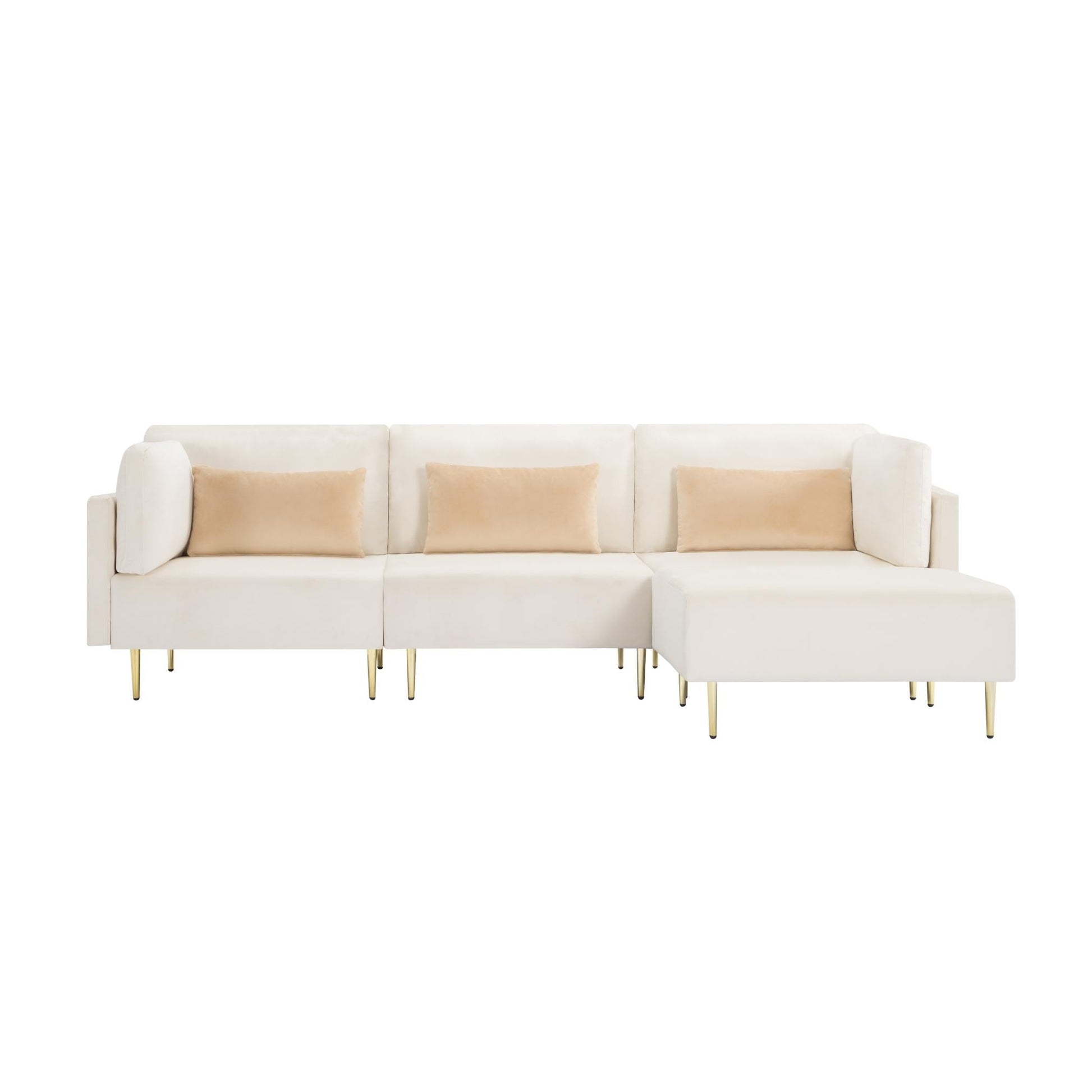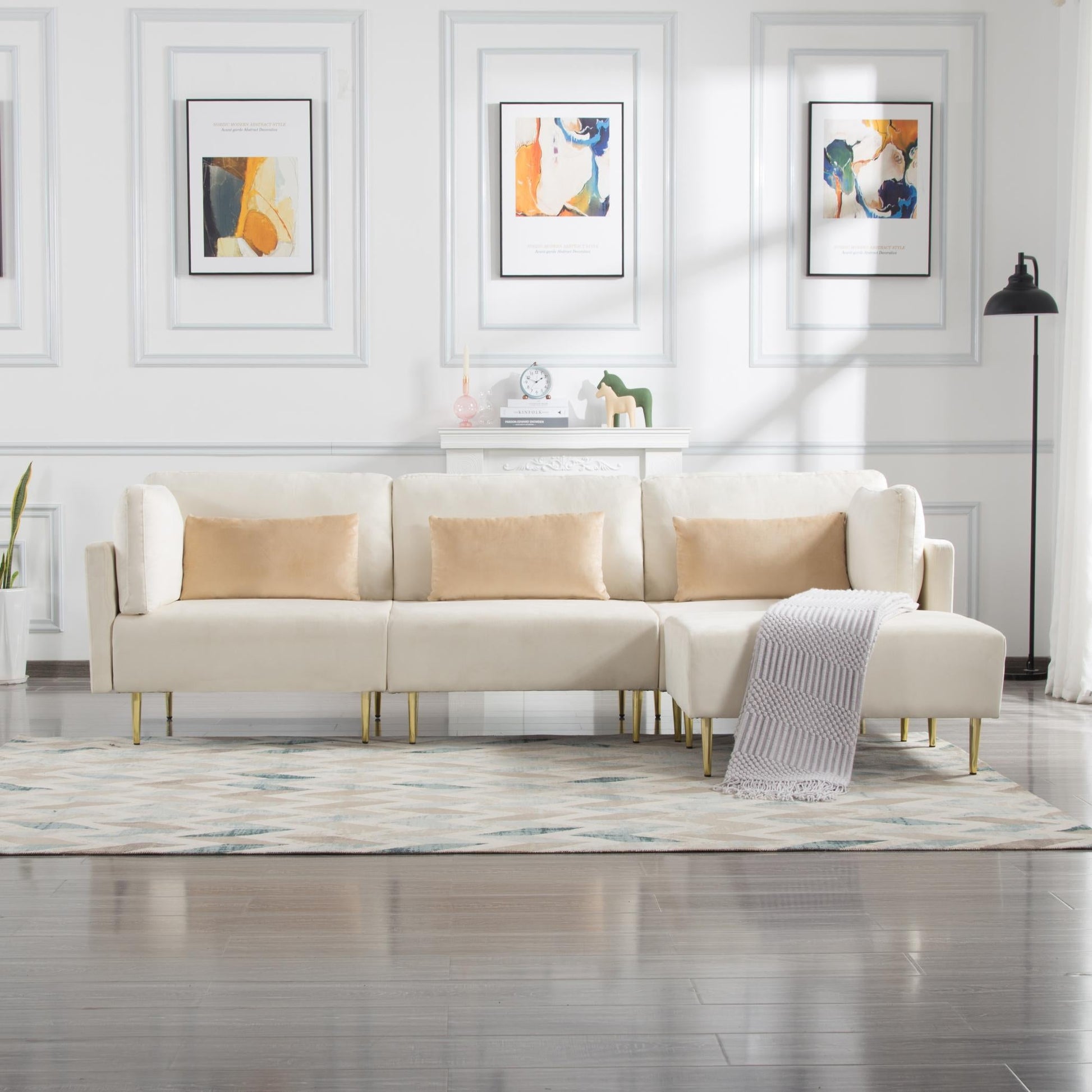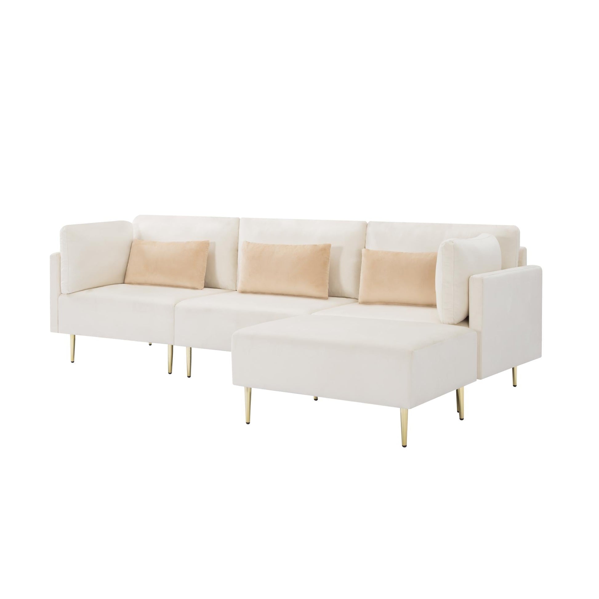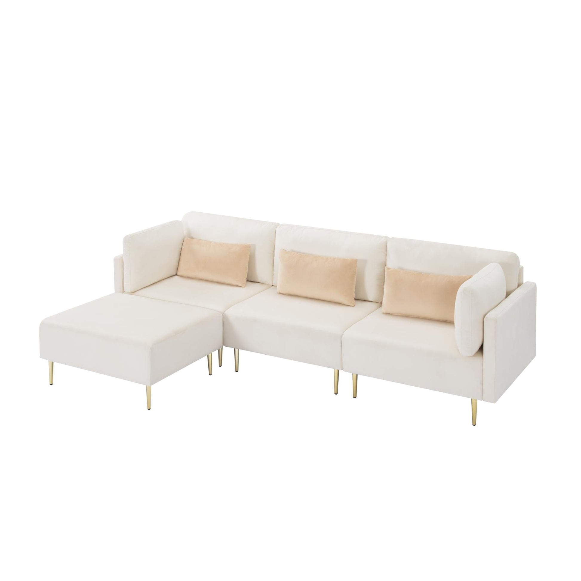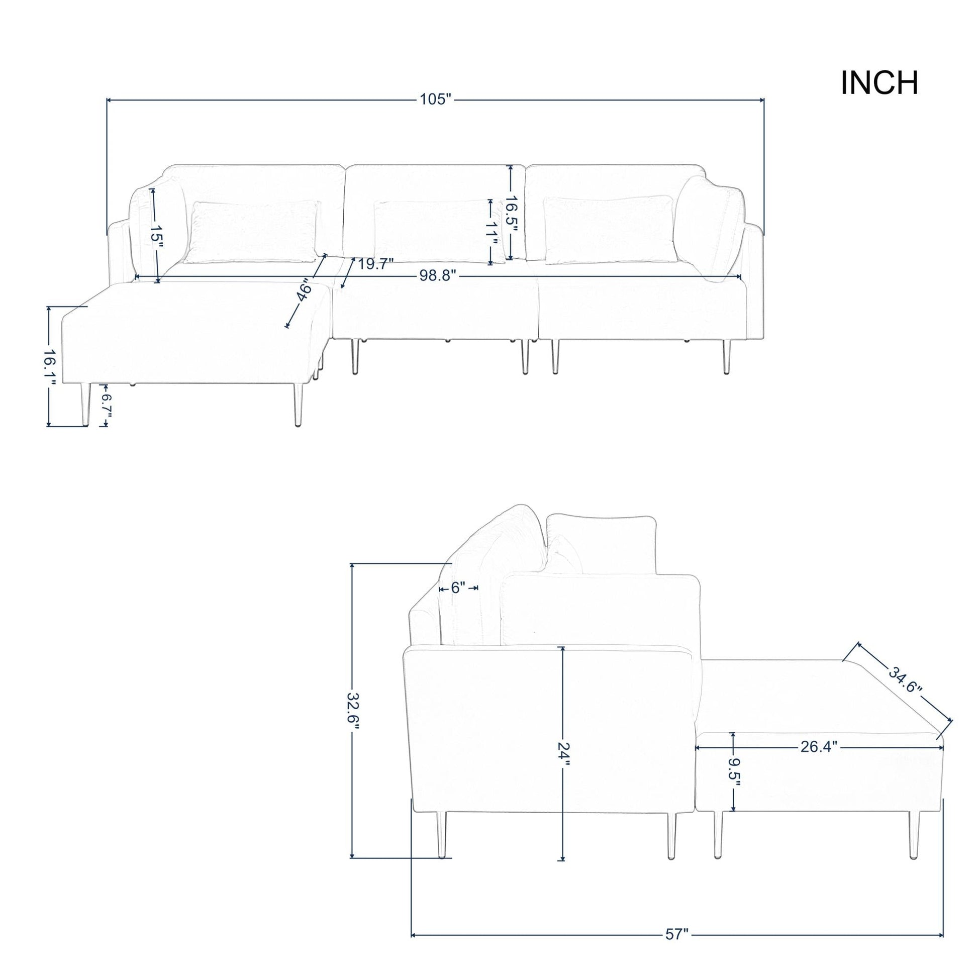 Product Overview Description / Features - 105” L Shaped Sectional Sofa with ottoman. The modern design sectional sofa meets all your decorating needs, sink into this sofa chaise and enjoy a relaxing time at home or office. - Structured in a solid wood frame, which it’s sturdy and durable. - Upholstered with velvet, back cushions are removable. - The ottoman is movable, so the chaise could be at either right or left side, free combination as per your living room area. - Sturdy metal legs in golden color offers distinctive contrast, legs with non-slip foot pads to protect the floor from scratches. - Lumbar pillows and armrest pillows included. - Compressed back cushion & seat cushion. Please rebound 72 hours after opening the package for your perfect use. Caution *** Please do not open the compressed packaging until your sofa frame is completely assembled, otherwise it can’t be repacked in original packing way to return. *** Please review the product dimension and check if it’s suitable for your living room. *** It might be have color difference due to photograph lighting, or computer monitor displayed. It’s not quality issue. Product Details Weights & Dimensions Overall - Sofa : 105” x 57” x 32.6”H Seat Height : 16.1” Back Height : 16.5” Arm Height : 24” Leg Height : 6.7” Minimum door width : 8” Product Weight : 154 LBS Package Weight : 180.79 LBS Carton size : (1)33.86” x 31.89” x 11.81” / 46.3 LBS (2)33.86” x 31.89” x 11.81” / 46.3 LBS (3)33.86” x 31.89” x 11.81” / 46.3 LBS (4)35.43” x 27.17” x 11.81” / 41.89 LBS Specifications Product Type : Sectional Design : Sofa & Chaise Shape : L-Shaped Orientation : Reversible Number of Pieces : 4 Seating Capacity : 4 Upholstery Material : Velvet Upholstery Colour : Black, Beige Seat Fill Material : Foam Back Fill Material : Synthetic Fiber Frame Material : Solid + Manufactured Wood Seat Construction : Solid wood + Sinuous Spring Leg Material : Metal legs Leg Color : Golden color Back Type : Cushion back Arm Type : Square arms Back & Seat : Back Cushions are removable Toss Pillows : Yes Wood Species : Eucalyptus Joinery : Corner-block-reinforced Main Wood Joinery Method : Basic Butt Kiln-Dried Wood : Yes Storage : No Weight Capacity : 300 LBS each seat Product Care : Wipe clean with dry cloth, do not use strong liquid cleaners Intended Use : Residential Use Country of Origin : China Shipping : Courier Assembly Assembly Required : Yes Level of Assembly : Partial Assembly Assembly Time : 20 Minutes Adult Assembly Required : Yes Suggested Number of People : 2 Additional Tools Required : All tools included