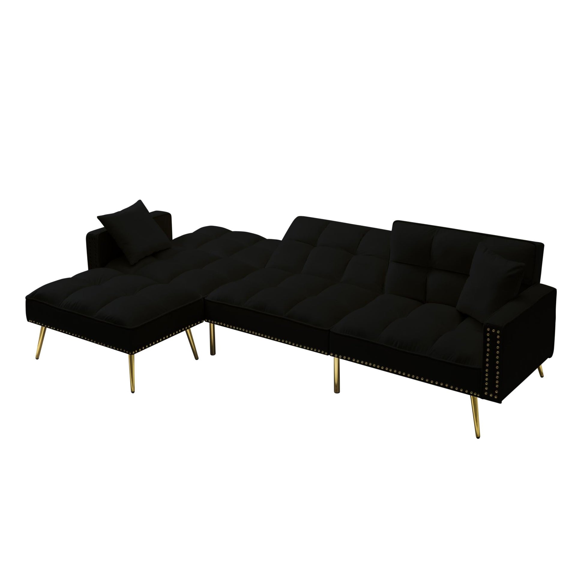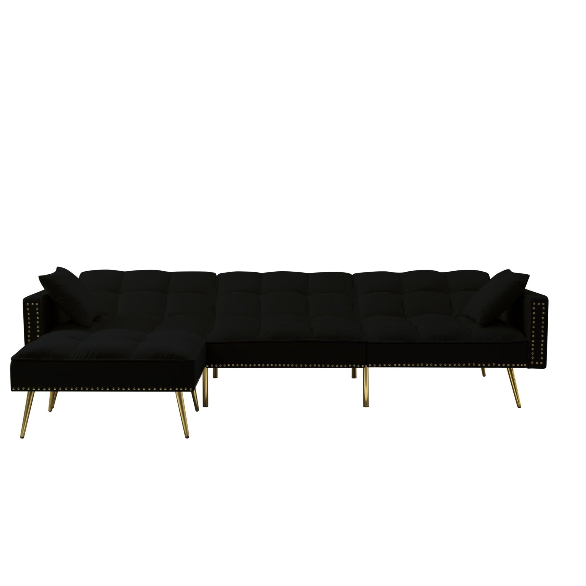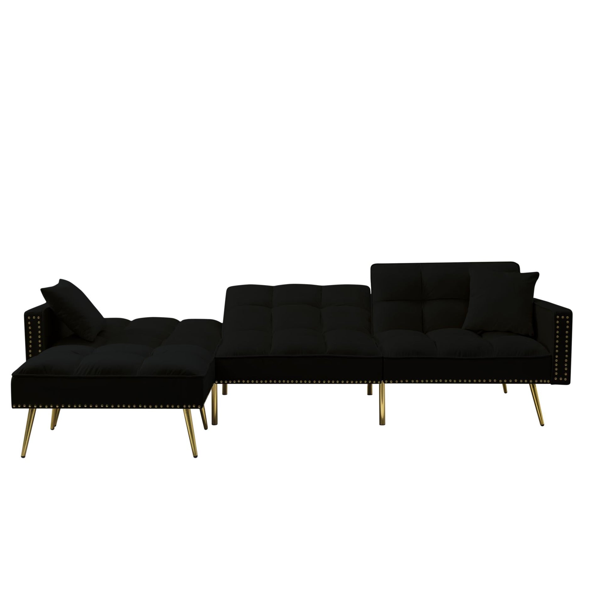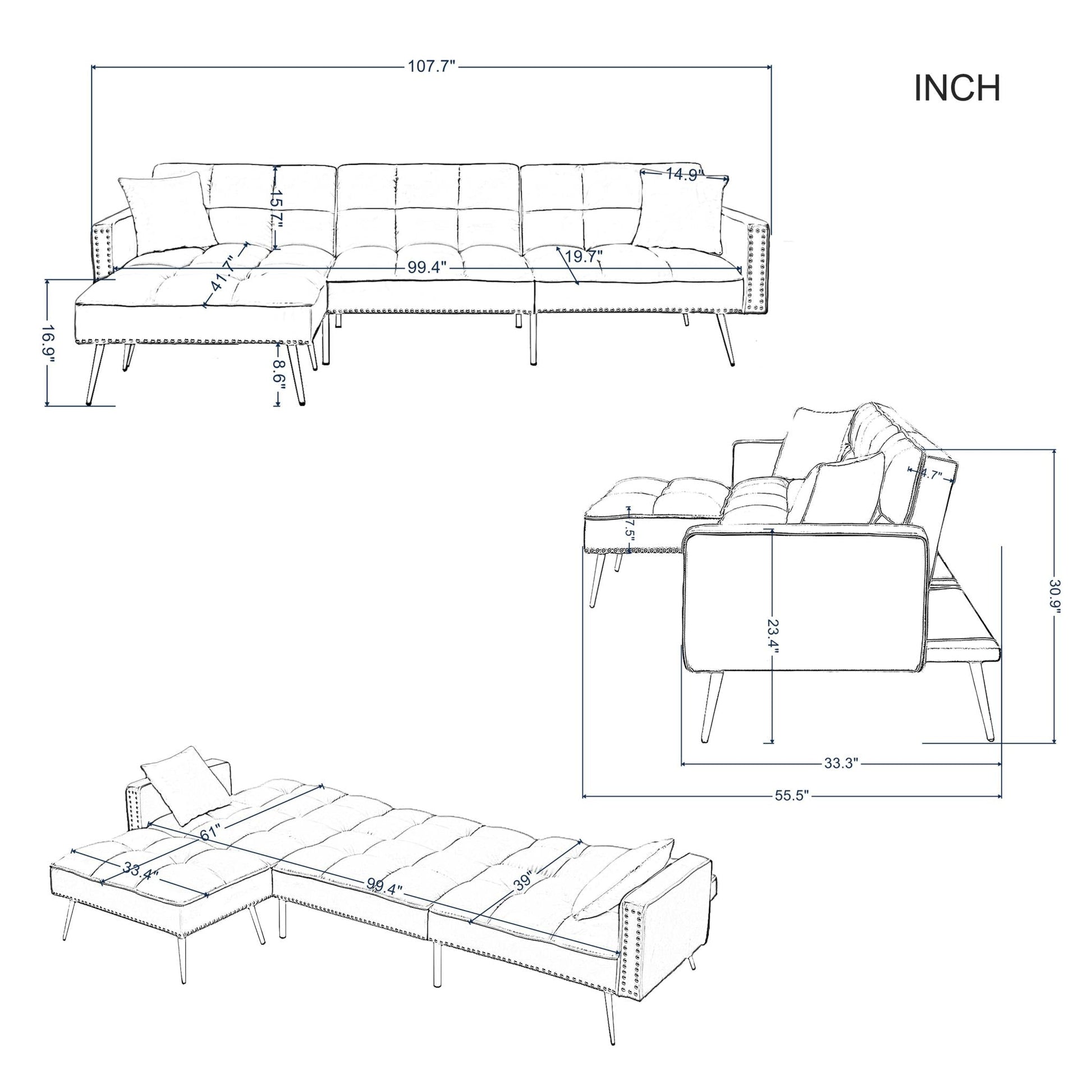 Product Overview Description / Features - 107.7” Sectional Sleeper Sofa bed, can be converted to a fully functioning futon sleeper in few seconds, it is an excellent option for your home, office, and guest room. - Multi-functional design: The backrest has 3 adjustable positions , and converted into a sleeping bed. Perfect for unexpected overnight guests, or just a handy spot for a nap. - Founded on a solid and manufactured wood frame. - Featuring a split back, square arms, and tapered metal legs, this sofa showcases a clean-lined silhouette perfect for adding a modern touch to any living ensemble. - The split-back design of this convertible sofa is made to offer each guest their own level of comfort, from sitting up to lounging back. You can even lay flat both the seat and back cushions to create a comfortable place. - Soft velvet, arms and seat front with nailheads decor. - Golden color metal legs, and 2 toss pillows included. *** Please review the product dimension and check if it’s suitable for your room. *** It might be have color difference due to photograph lighting, or computer monitor displayed. It’s not quality issue. *** The sofa legs and hardware are packed in the bottom of the seat. Please take out after unpacking for further assembly. Product Details Weights & Dimensions Overall - Sofa : 107.7” x 55.5” x 30.9”H - Sleeper : 107.7” x 61” x 23.4”H Back Cushion : 15.7”H Seat Height : 16.9” Arm Height : 23.4” Leg Height : 8.6” Product Weight : 133.1 LBS Carton size : (1)39.37” x33.86” x 8.27” /45.19 LBS (2)39.37” x33.86” x 8.27” /45.19 LBS (3)39.37” x33.86” x 8.27” /45.19 LBS (4)33.86” x22.44” x 8.27” /22.05 LBS Specifications Product Type : Sofa & Ottoman Design : Sleeper Sleeper size : Full size Number of Pieces : 4 Seating Capacity : 4 Orientation : Reversible Upholstery Material : Velvet Upholstery Colour : Black Seat Fill Material : Foam Back Fill Material : Foam Frame Material : Solid + Manufactured Wood Seat Construction : Solid wood + Sinuous Spring Wood Species : Eucalyptus Leg Material : Metal Leg Leg Color : Golden Color Seat Style : Tufted Seat Arm TypeSquare Arm Back & Seat : Not Removable Toss Pillows : 2 Joinery : Corner-block-reinforced Main Wood Joinery Method : Basic Butt Kiln-Dried Wood : Yes Weight Capacity : 300 LBS each seat Shipping : Courier Minimum Door width : 9” Product Care : Wipe clean with dry cloth, do not use strong liquid cleaners Intended Use : Residential Use Country of Origin : China Assembly Assembly Required : Yes Level of Assembly : Partial Assembly Assembly Time : 20 Minutes Adult Assembly Required : Yes Suggested Number of People : 2 Additional Tools Required : All tools included