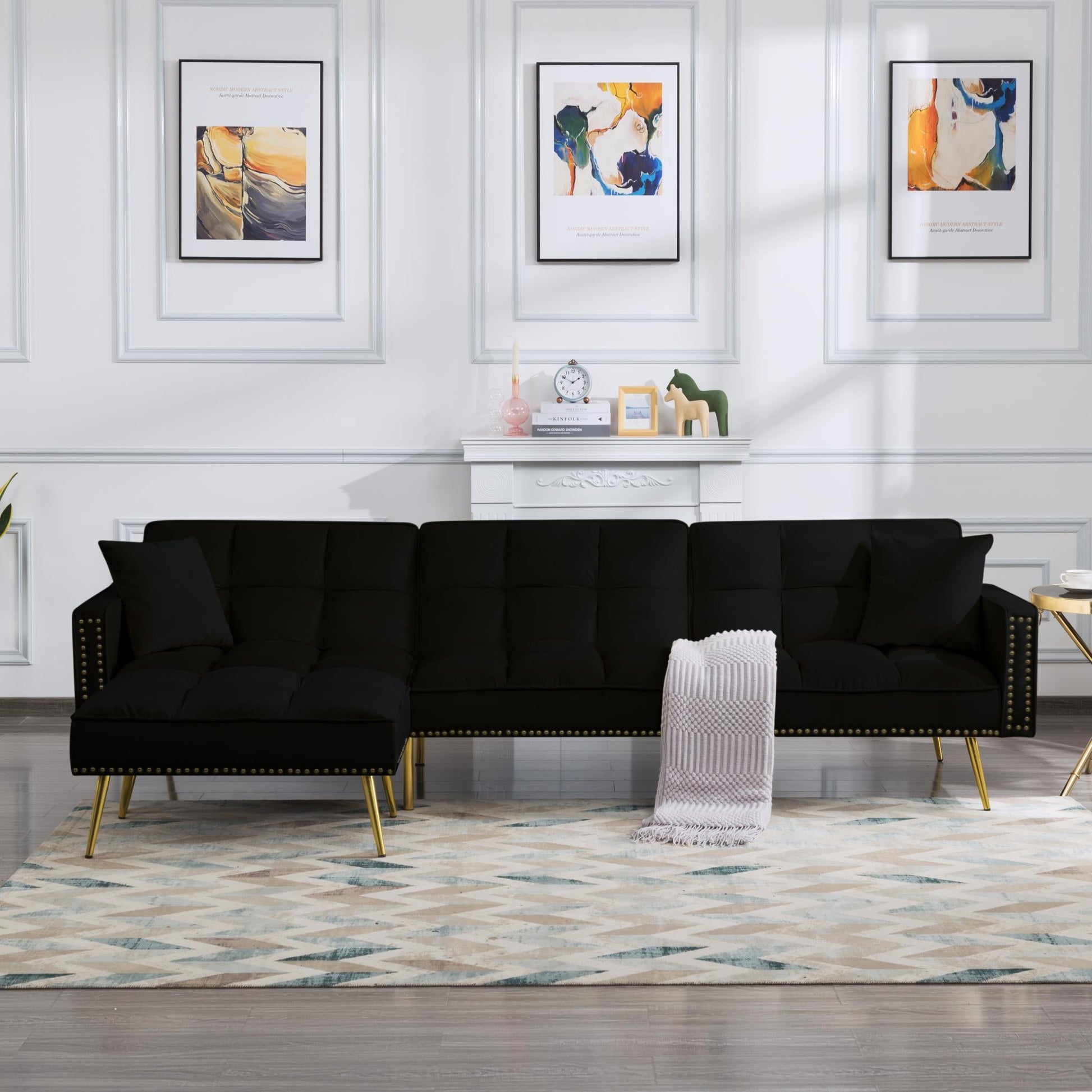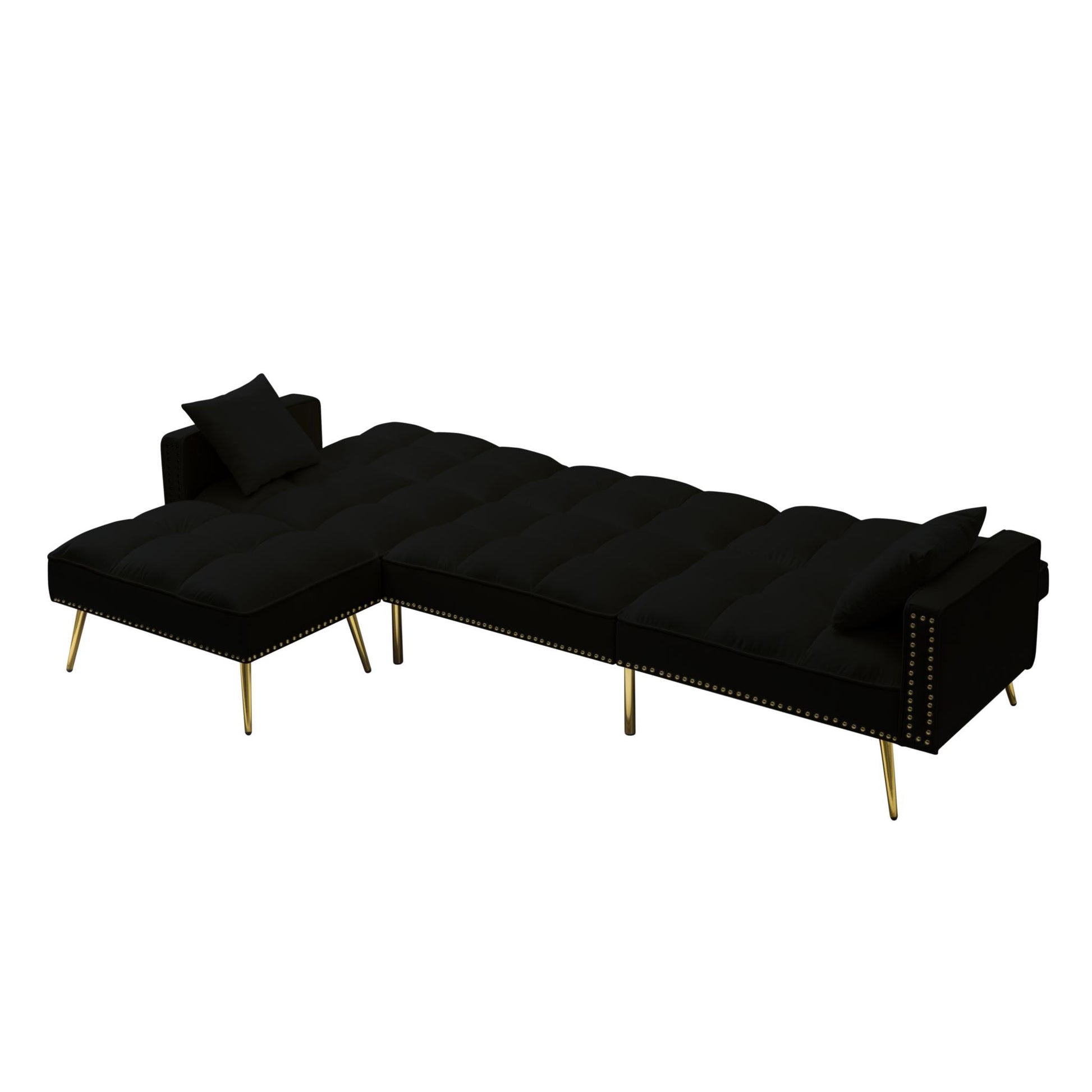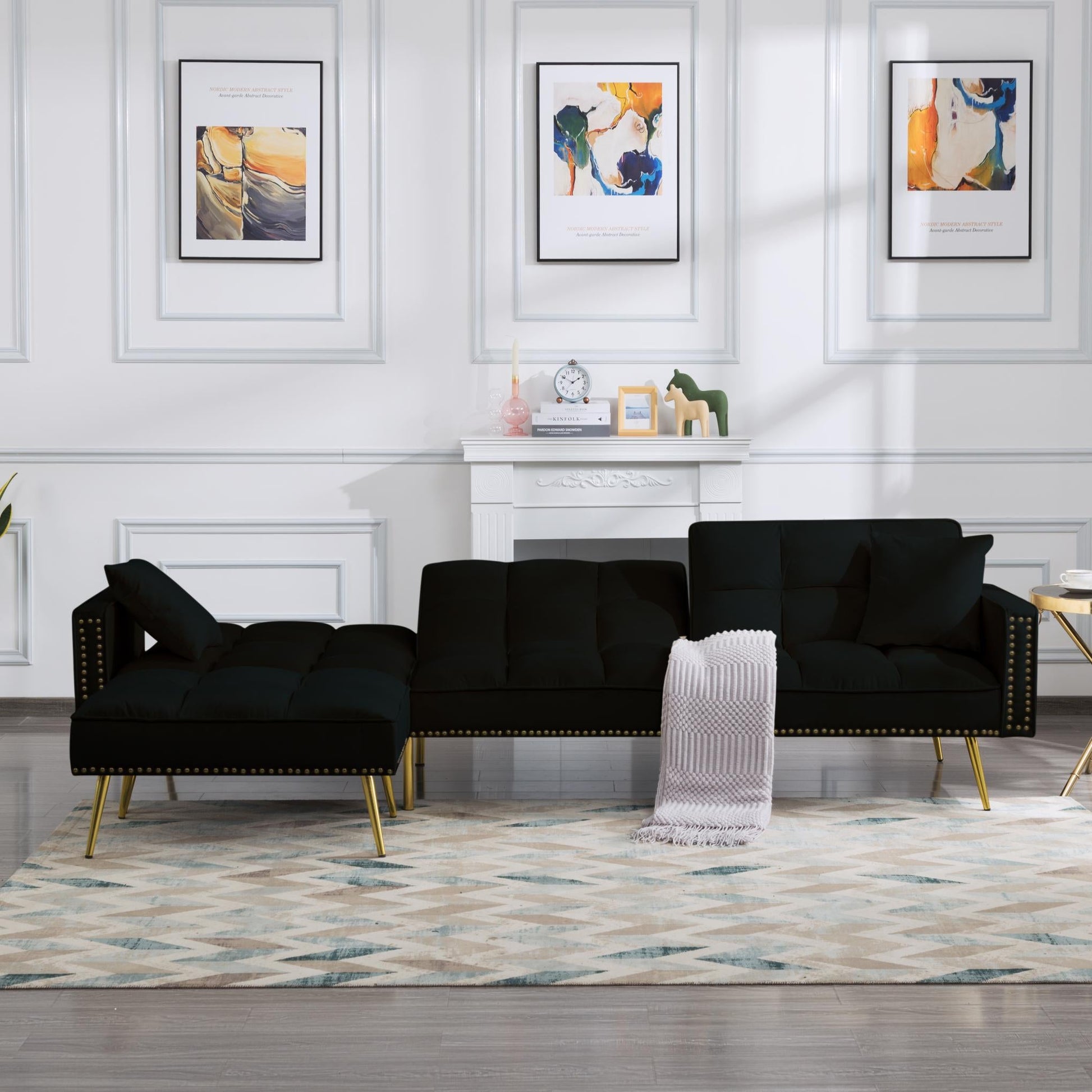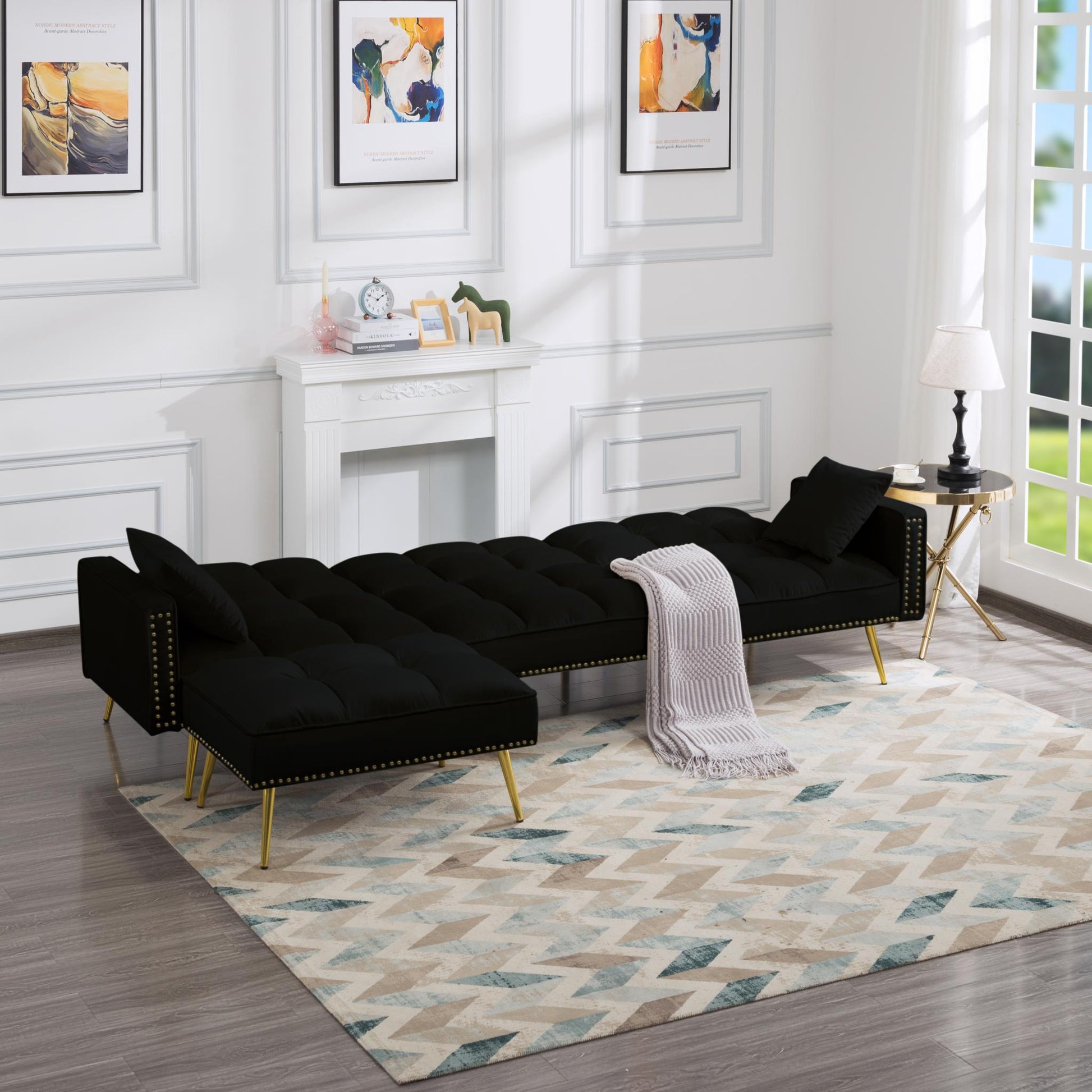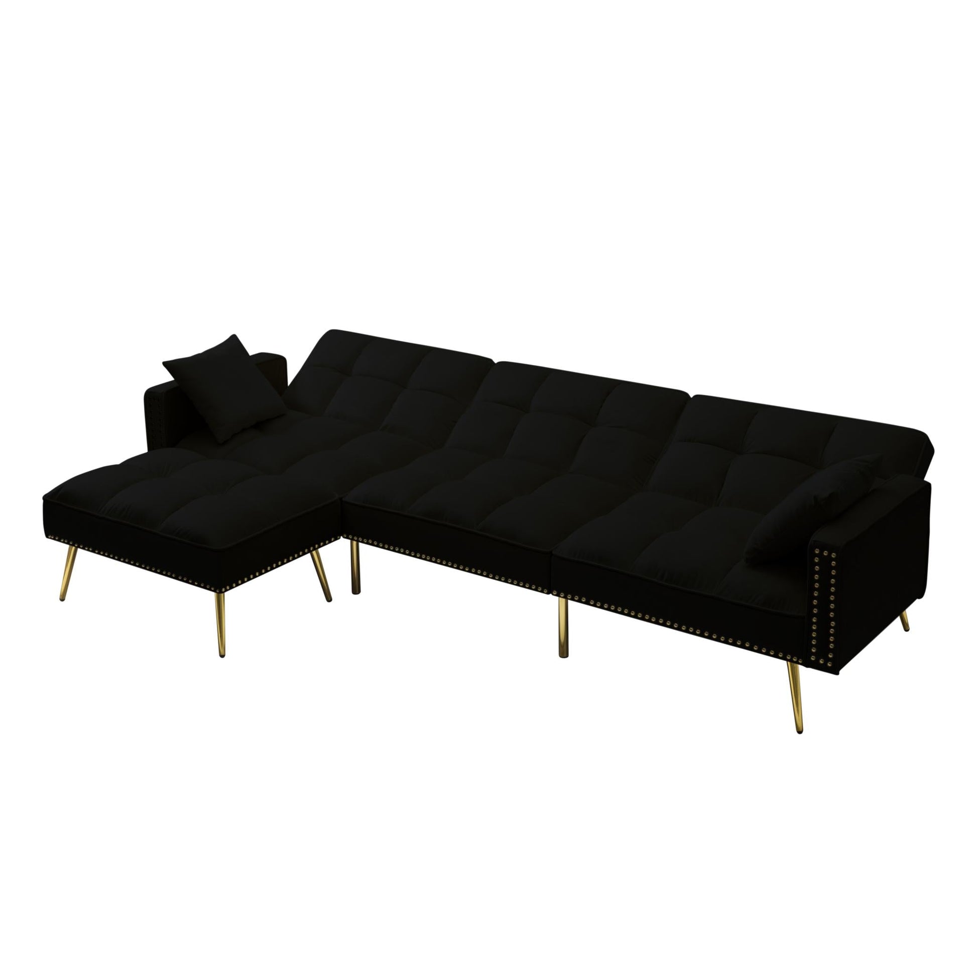 Product Overview Description / Features - 107.7” Sectional Sleeper Sofa bed, can be converted to a fully functioning futon sleeper in few seconds, it is an excellent option for your home, office, and guest room. - Multi-functional design: The backrest has 3 adjustable positions , and converted into a sleeping bed. Perfect for unexpected overnight guests, or just a handy spot for a nap. - Founded on a solid and manufactured wood frame. - Featuring a split back, square arms, and tapered metal legs, this sofa showcases a clean-lined silhouette perfect for adding a modern touch to any living ensemble. - The split-back design of this convertible sofa is made to offer each guest their own level of comfort, from sitting up to lounging back. You can even lay flat both the seat and back cushions to create a comfortable place. - Soft velvet, arms and seat front with nailheads decor. - Golden color metal legs, and 2 toss pillows included. *** Please review the product dimension and check if it’s suitable for your room. *** It might be have color difference due to photograph lighting, or computer monitor displayed. It’s not quality issue. *** The sofa legs and hardware are packed in the bottom of the seat. Please take out after unpacking for further assembly. Product Details Weights & Dimensions Overall - Sofa : 107.7” x 55.5” x 30.9”H - Sleeper : 107.7” x 61” x 23.4”H Back Cushion : 15.7”H Seat Height : 16.9” Arm Height : 23.4” Leg Height : 8.6” Product Weight : 133.1 LBS Carton size : (1)39.37” x33.86” x 8.27” /45.19 LBS (2)39.37” x33.86” x 8.27” /45.19 LBS (3)39.37” x33.86” x 8.27” /45.19 LBS (4)33.86” x22.44” x 8.27” /22.05 LBS Specifications Product Type : Sofa & Ottoman Design : Sleeper Sleeper size : Full size Number of Pieces : 4 Seating Capacity : 4 Orientation : Reversible Upholstery Material : Velvet Upholstery Colour : Black Seat Fill Material : Foam Back Fill Material : Foam Frame Material : Solid + Manufactured Wood Seat Construction : Solid wood + Sinuous Spring Wood Species : Eucalyptus Leg Material : Metal Leg Leg Color : Golden Color Seat Style : Tufted Seat Arm TypeSquare Arm Back & Seat : Not Removable Toss Pillows : 2 Joinery : Corner-block-reinforced Main Wood Joinery Method : Basic Butt Kiln-Dried Wood : Yes Weight Capacity : 300 LBS each seat Shipping : Courier Minimum Door width : 9” Product Care : Wipe clean with dry cloth, do not use strong liquid cleaners Intended Use : Residential Use Country of Origin : China Assembly Assembly Required : Yes Level of Assembly : Partial Assembly Assembly Time : 20 Minutes Adult Assembly Required : Yes Suggested Number of People : 2 Additional Tools Required : All tools included
