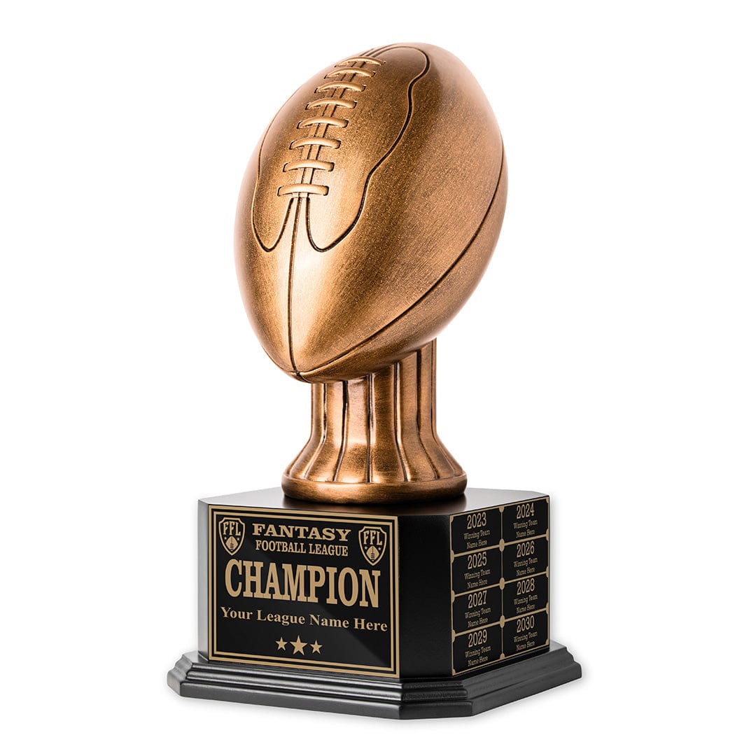The Antique Gold Football trophy is a glorious monument to your fantasy greatness.  The names of current and former champions glisten off the custom engraved plaques, and the trophy is the perfect weight to hoist triumphantly over your head and parade through your draft as your league mates look on in desperate sadness. This golden glory stands 16″ tall and weighs a sturdy 7 pounds.