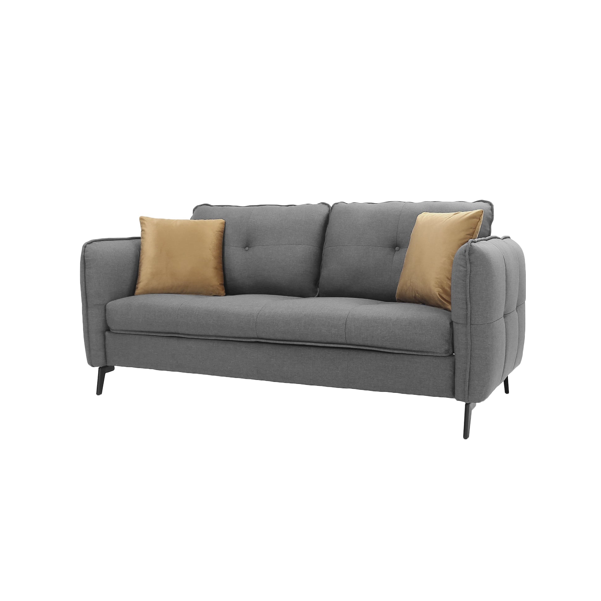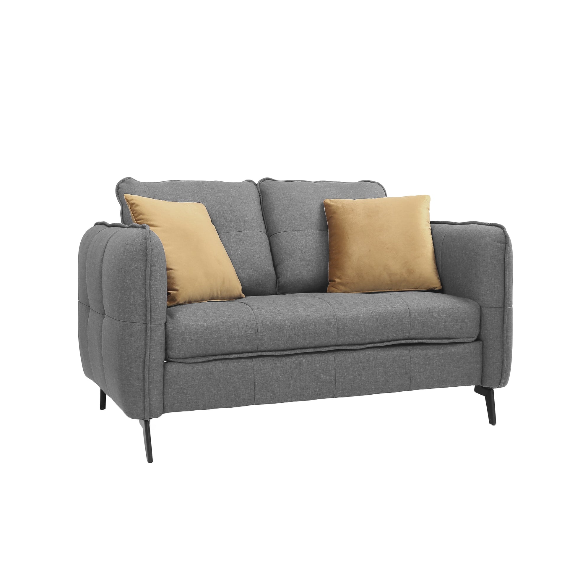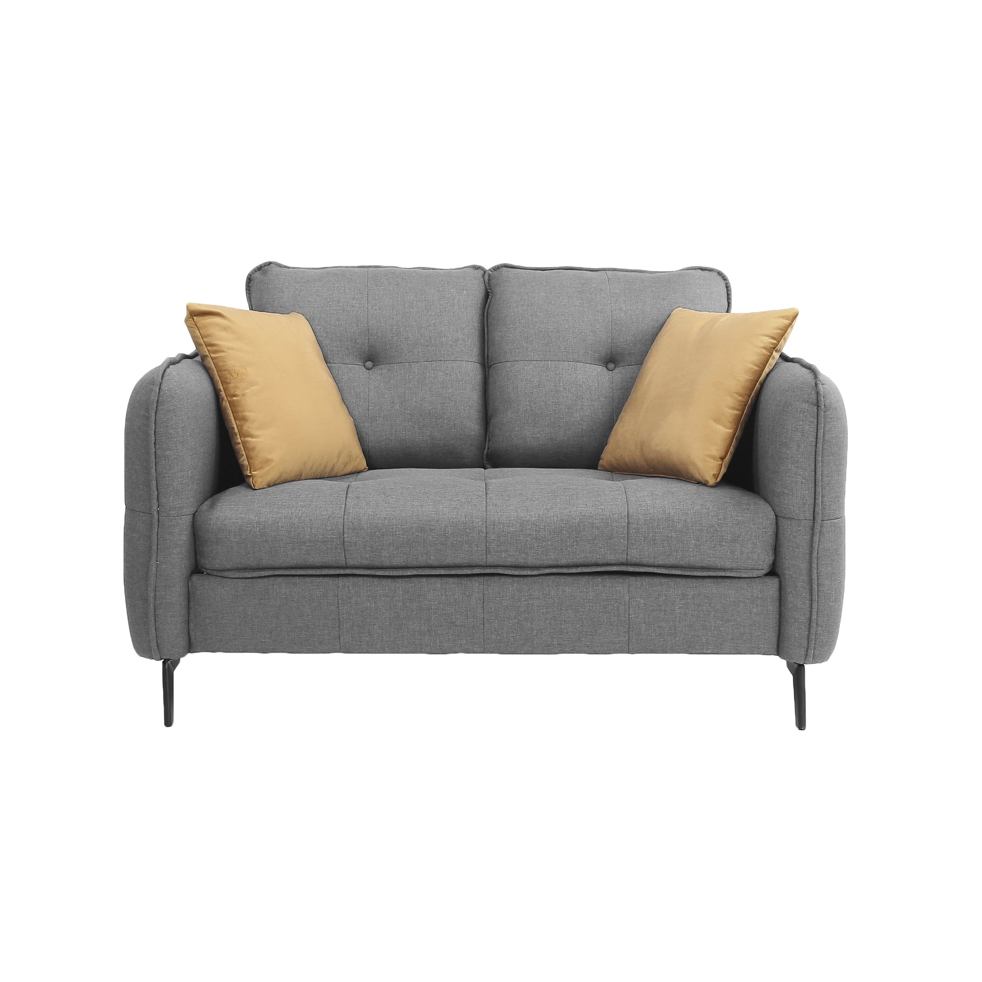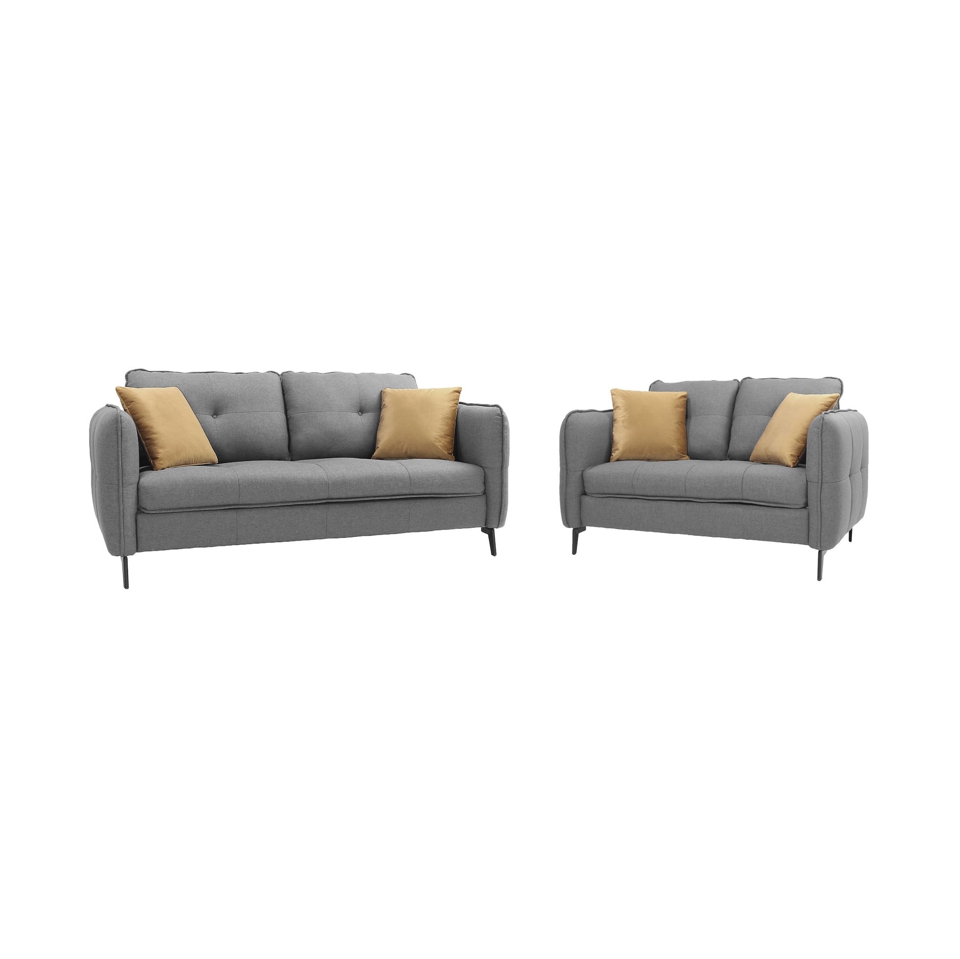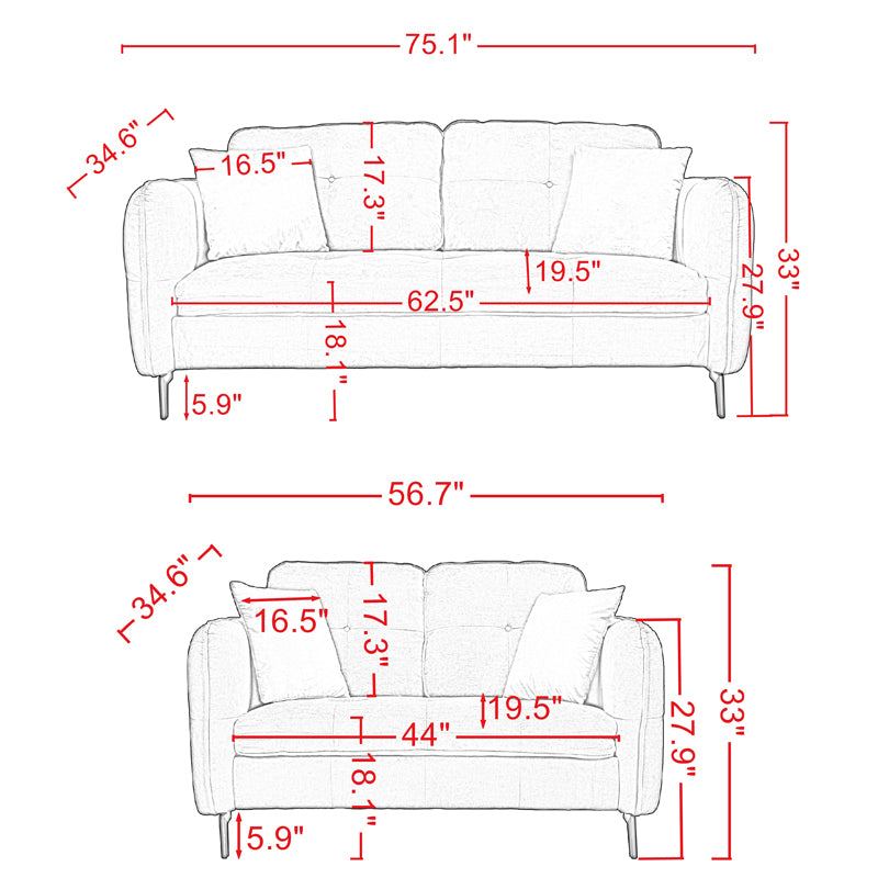 Product Overview Description / Features - 2 pieces Living room set, a Sofa and a loveseat, modern contemporary design, nice relaxing with family and friends at home. - Fine workmanship and button tufting with piping edge; -Seat cushions and back cushions are removable and washable; - 2 kind of fabric for choosing, polyester blend or 100% polyester; - Metal legs in black color; - Compressed back cushion & seat cushion. Please rebound 72 hours after opening the package for your perfect use. Caution*** Please do not open the compressed packaging until your sofa frame is completely assembled, otherwise it can’t be repacked in original packing way to return. *** Please review the product dimension and check if it’s suitable for your living room *** It might be have color difference due to photograph lighting, or computer monitor displayed. Product Details Weights & Dimensions Overall size -Sofa 75.1” x34.6”x 33”H Overall size -Loveseat 56.7” x34.6”x 33”H Back Cushion 17.3”H Seat Height 18.1” Arm Height 27.9” Leg Height 5.9” Product Weight -Sofa 88.66 LBS Gross Weight -Sofa 101.41 LBS Carton size & Gross weight -Sofa 65.75” x 25.2” x 7.28”, 63.93LBS 35.04” x 23.23” x 14.17”, 37.48LBS Product Weight -Loveseat 75.46 LBS Gross Weight -Loveseat 87.52 LBS Carton size & Gross weight -Loveseat 48.03” x 24.8” x 7.28”, 50.04LBS 35.04” x 23.23” x 14.17”, 37.48LBS Specifications Product Type Living Room Sets Design Sofa & Loveseat Orientation Standard Seating Capacity 5 Upholstery Material Upholstery Colour Grey (100% polyester), Navy blue (100% polyester) Dark Grey (Polyester Blend) Seat Fill Material Foam + Pocket Spring Back Fill Material Synthetic Fiber Frame Material Metal + Solid wood + Manufactured Wood Wood Species Eucalyptus Leg Material Metal Leg Color Black Back Type Cushion back Arm Type Square arm Toss Pillows 2 Back & Seat Removable Reversible No Storage No Joinery Corner-block-reinforced Main Wood Joinery Method Basic Butt Kiln-Dried Wood Yes Weight Capacity 300 LBS each seat Intended Use Residential Use Warranty One Year Country of Origin China Shipping Courier Minimum Door width 15” Product Care Wipe clean with dry cloth, do not use strong liquid cleaners Assembly Assembly Required Yes Level of Assembly Partial Assembly Assembly Time 30 Minutes Adult Assembly Required Yes Suggested Number of People 2 Additional Tools Required All tools included