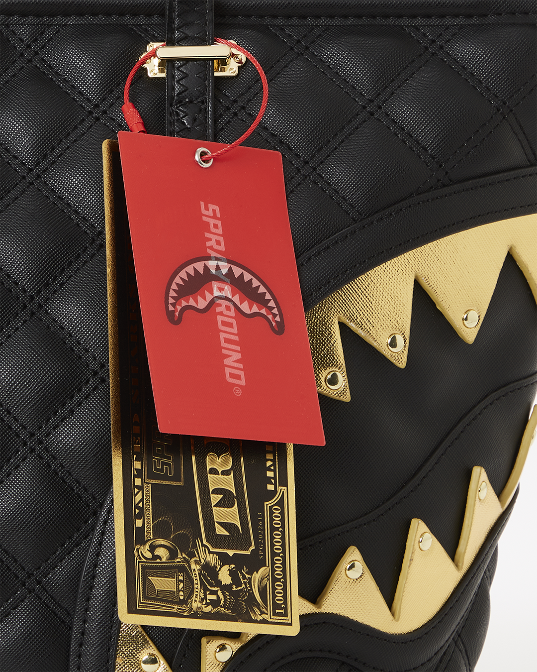 Sophisticated quilted faux leather collection. Accented with metallic gold shark mouths and nail head hardware details.