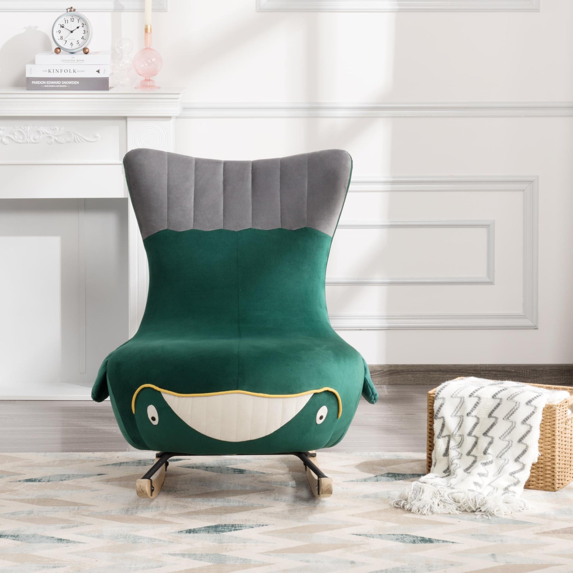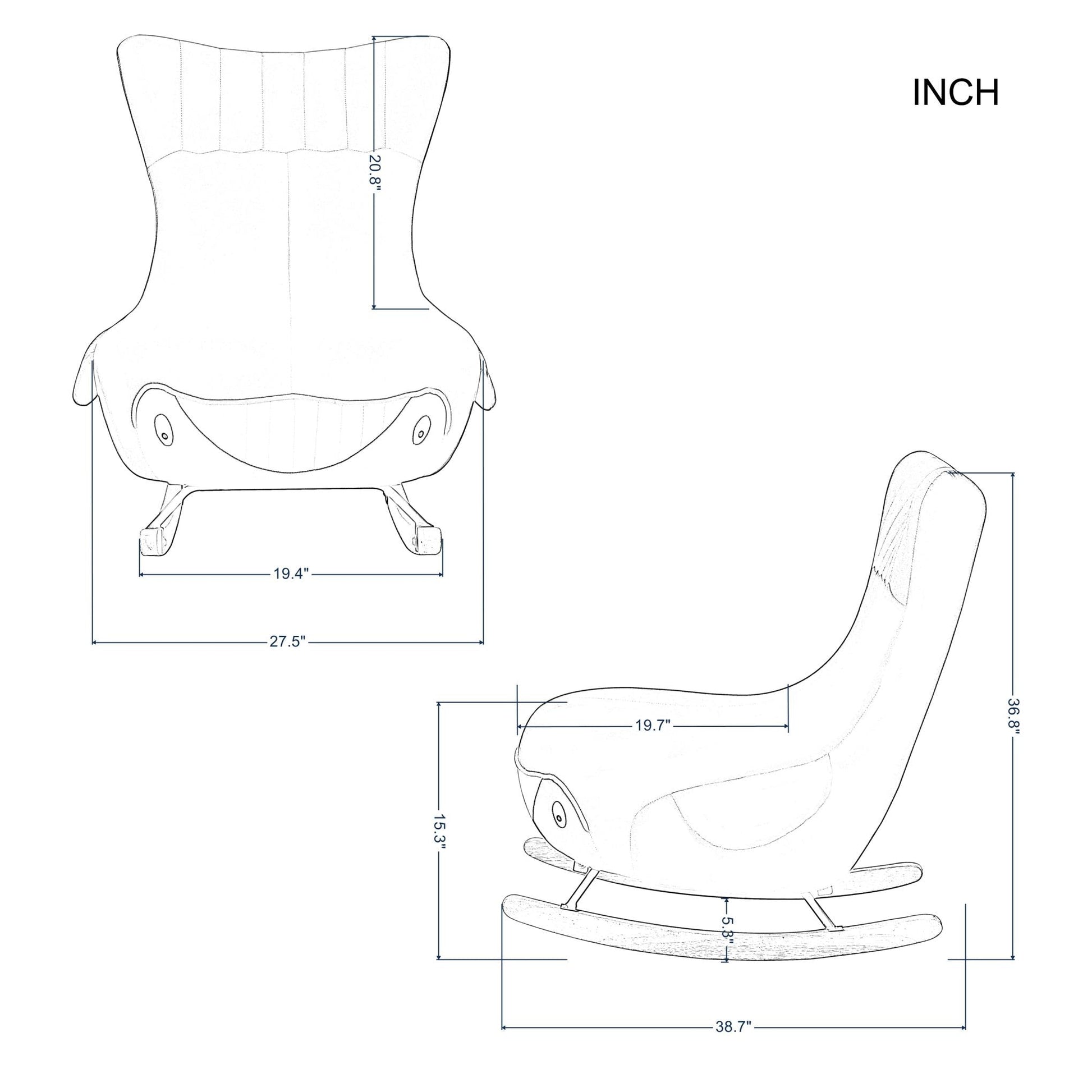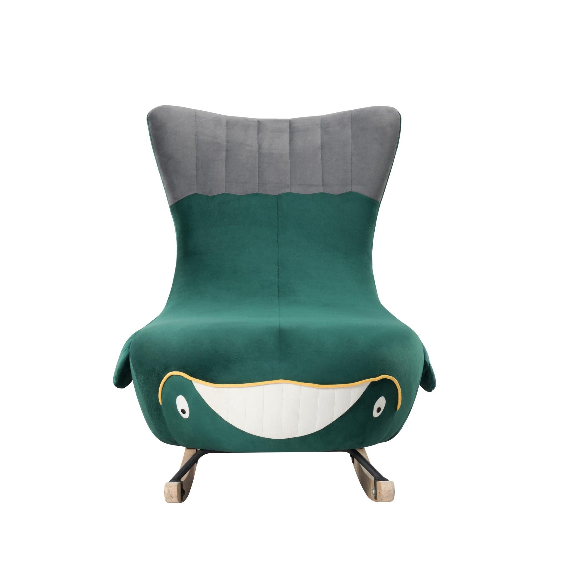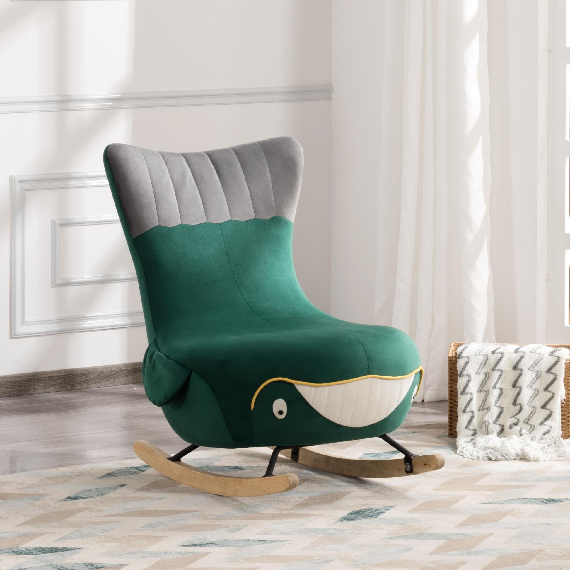 Product Overview Description / Features - 27.5” Whale Rocking chair. The design of the rocking chair makes it fit every scene, bedroom, living room, porch or office, it can decorate all the places perfectly. Take a moment to relax your body and relieve the fatigue after a hard day of work. - Upholstered with velvet that is delicate and smooth to the touch. - Made of Solid wood legs and metal support, which has nice stability and durability. - Non-slip pad under the wood legs brings a soothing effect. The swing range does not exceed 30°, making it rock gently and smoothly. - Easy to assemble and hardware tools are included. CAUTION: DO NOT leave child alone on the chair. *** Please review the product dimension and check if it’s suitable for your living room *** It might be have color difference due to photograph lighting, or computer monitor displayed. It’s not quality issue. Product Details Weights & Dimensions Sofa -overall size:27.5” x38.7”x 36.8”H Back Cushion:20.8”H Seat Height:15.3” Seat Depth:19.7” Leg Height:5.3” Product Weight:30.8 LBS Gross Weight:39.68 LBS Carton size:32.48” x 32.48” x 27.56” Specifications Product Type:Rocking chair Seating Capacity:1 Upholstery Material:Velvet Upholstery Colour:Green Seat Fill Material:Foam Back Fill Material:Foam Frame Material:Solid + Manufactured Wood Seat Construction:Solid wood Wood Species:Eucalyptus Leg Material:Rubber Wood Leg Color:Natural Back Type:Tight back Toss Pillows:No Back & Seat:Not Removable Weight Capacity:300 LBS Intended Use:Residential Use Warranty:One Year Country of Origin:China Shipping:Courier Minimum Door width:28” Product Care:Wipe clean with dry cloth, do not use strong liquid cleaners Assembly Required:Yes Level of Assembly:Partial Assembly Assembly Time:10 Minutes Adult Assembly Required:Yes Suggested Number of People:2 Additional Tools Required:All tools included
