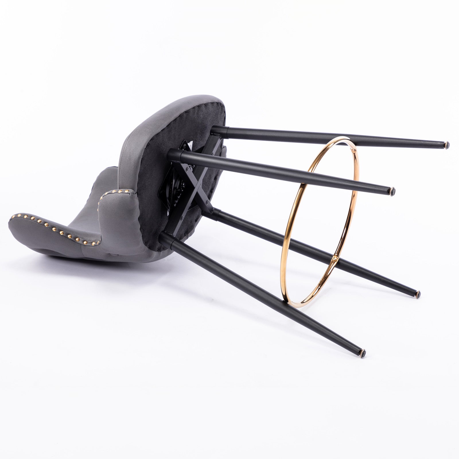 Thickened leather fabric; 180 ° rotation and self centering Gold nail head; Black metal legs with gold foot pads and toes; Easy to assemble;
