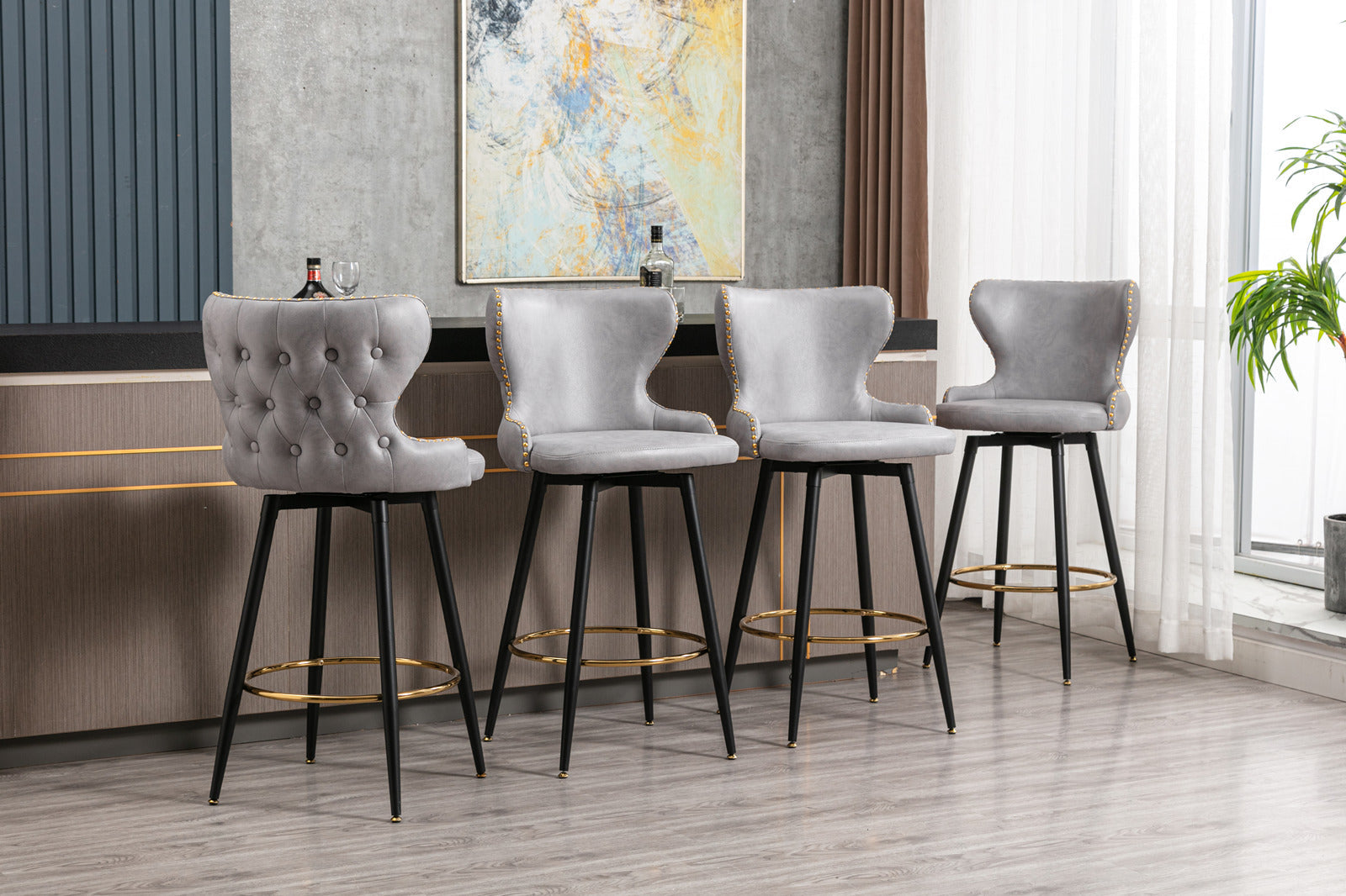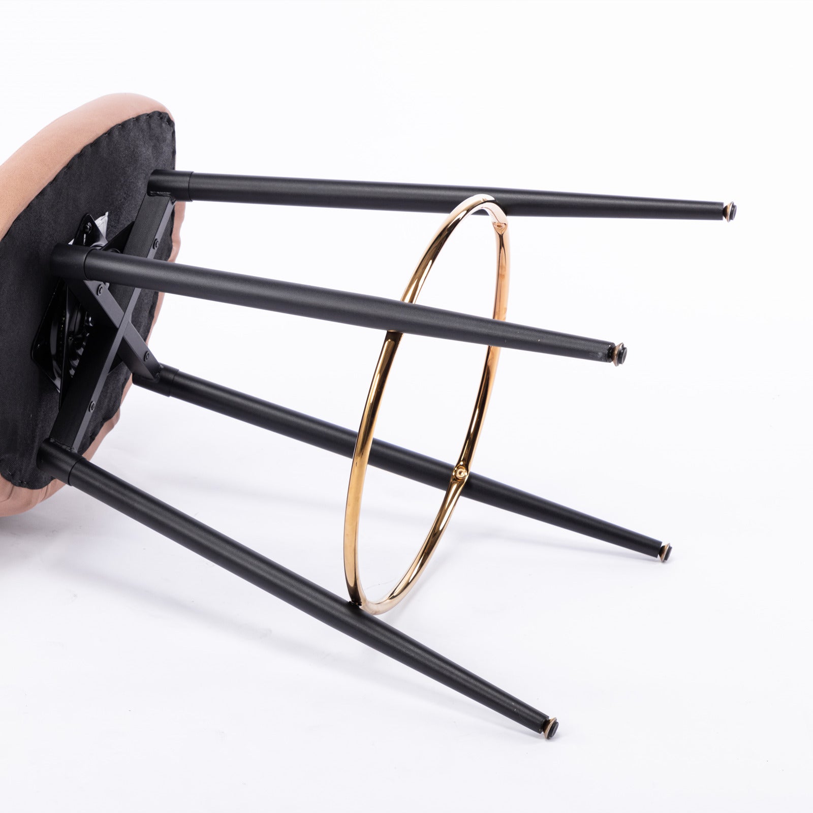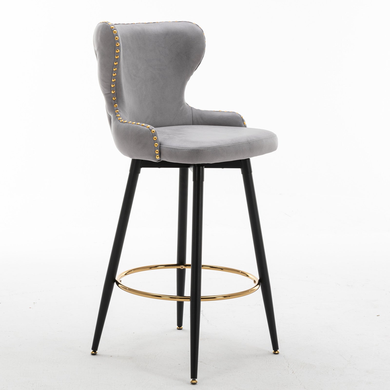 Thickened leather fabric; 180 ° rotation and self centering Gold nail head; Black metal legs with gold foot pads and toes; Easy to assemble;