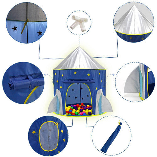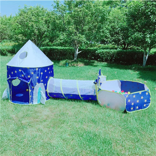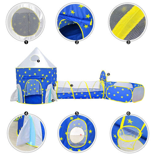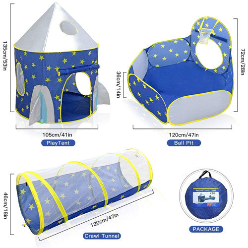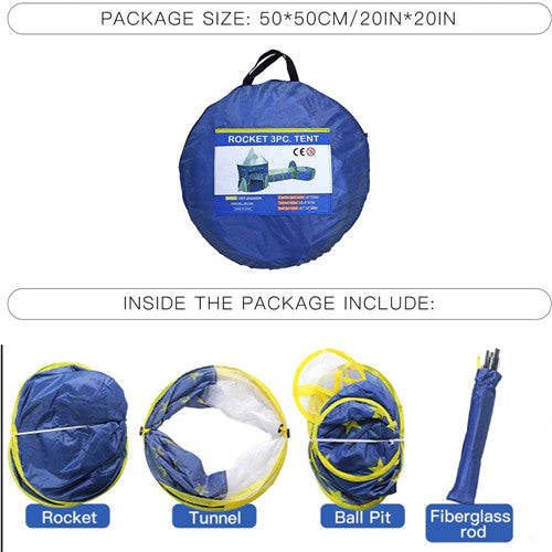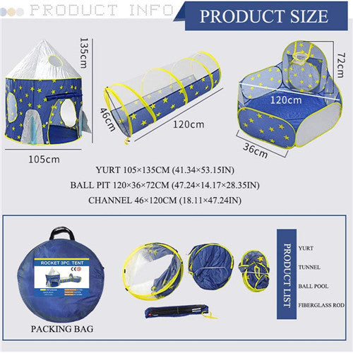 Specifications: Name: 3-piece Play Tent Set Yurt size: about 105*135cm/41.3*53.2in Ball pool size: about 120*36*72cm/47.3*14.2*28.4in Channel size: about 46*120cm/18.1*47.3in Single package size: about 48*48*4cm/20*20*2in Weight: about 3.3lbs Features: 1) Rocket ship tent desingn excellent to encourage imaginative and creative play. 2) Mesh window and sunroof allow air to circulate and keeps the bugs out. 3) Small size yet spacious interior allows usage in a compact home or playroom. 4) Includes sturdy foldable poles for quick and easy assembly of tent. 5) Stow it away just as fast as you set it up. Folds flat inside lightweight carrying bag for convenient storage. 6) Easy to clean material with a damp cloth or mild soap. 7) Beautiful colors and unique design will allow your play tent to standout from all the others! Six different ways to play, the kids can get lots of fun with our grow tent: 1) Use the rocketship play tent on its own as a castle or playhouse, encourage little astronauts to use their imaginations. 2) Use the tunnel by itself for kids to crawl through. 3) Fill the ball pit with hundreds of balls & let them jump & play basketball. 4) Combine the tunnel with the play tent as an extension. 5) Combine the tunnel with the ball pit. 6) Combine all 3 pieces for a richer & more playful experience, especially when the friends come over! Kindly Notice: 1) Age acquirement: 1 year and up 2) Please don't place heavy objects on the kids tent 3) The pop up play tent will quickly bounce open. Children should be used under adult supervision and guidance 4) For healthy use, please clean the play tent regularly, just need wipe with the wet towel 5) Avoid using this play tent on course surfaces like concrete or Pavement 6) PLAY PIT BALLS ARE NOT INCLUDED Package Include: 1 x Rocket Ship Play tent with Sunroof 1 x Ball Pit with Hoop 1 x Tunnel 1 x Lightweight, Compact Zipper Carrying Bag 1 x Instructions