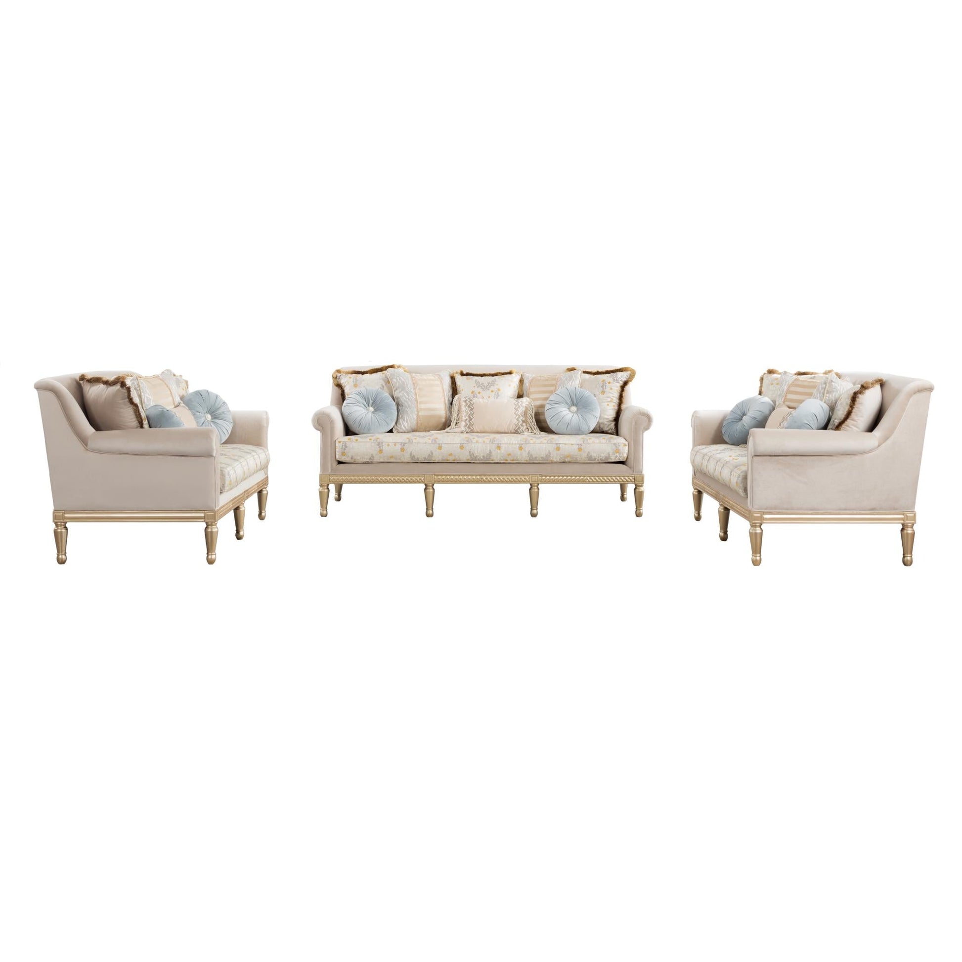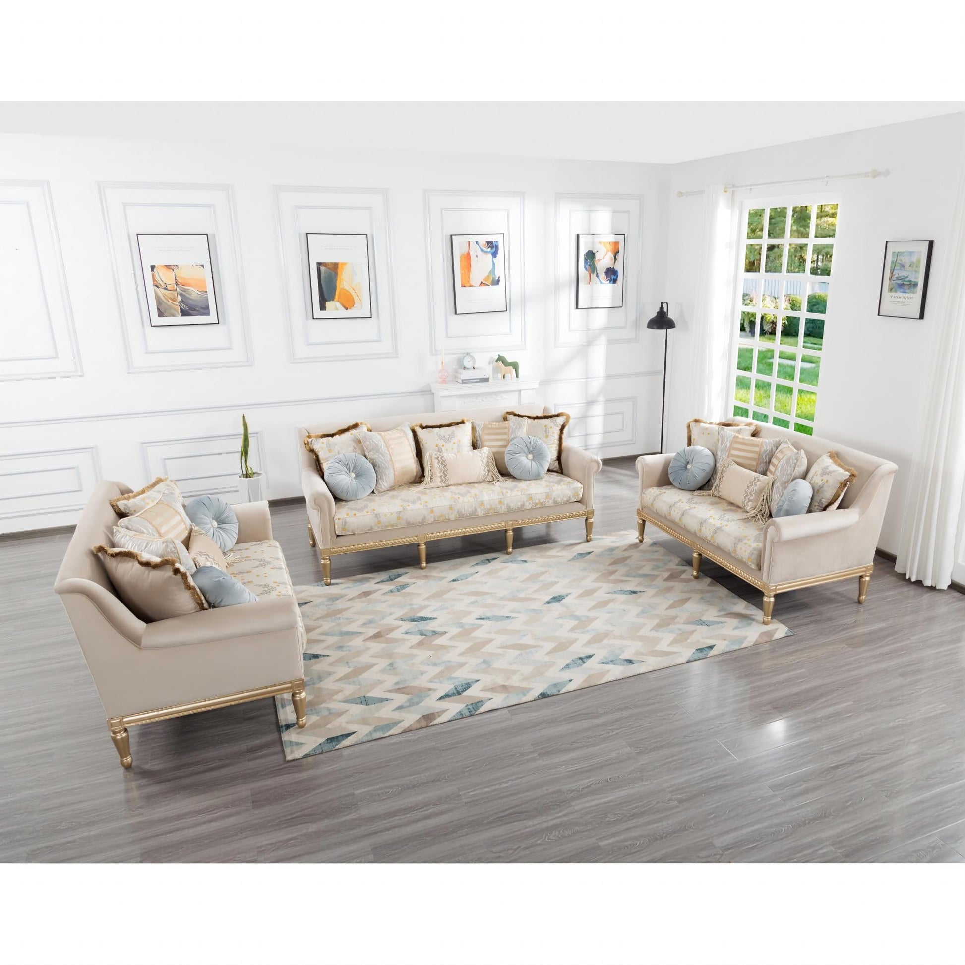 Product Overview Description / Features - 3 Piece Living Room Set, Classic style Sofa and loveseat is elegant and traditional stylish, the overall look is attractive and it’s a beautiful additional to your living room, office, etc. - Unique design, featuring a solid wood frame with handcrafted carving pattern and champagne color finish. - Structured in a solid wood frame, which it’s sturdy and durable. - Upholstered with soft skin-friendly velvet fabric and high-quality jacquard seat cushion, coming with floral fabric toss pillows as product picture shown. - Easy to assemble, only need to install the legs. *** Please review the product dimension and check if it’s suitable for your room. *** It might be have color difference due to photograph lighting, or computer monitor displayed. It’s not quality issue. Product Details Weights & Dimensions -Sofa Overall size : 85”x37.8”x37”H Back Cushion : 20”H Seat Height : 19.7” Seat Depth : 28.3” Leg Height : 8.7” Product Weight : 110.0 LBS Package Weight : 123.46 LBS Carton Size : 84.65”x38.98”x31.1” -Loveseat*2 Overall size : 64.6”x37.8”x37”H Back Cushion : 20”H Seat Height : 19.7” Seat Depth : 28.3” Leg Height : 8.7” Product Weight : 90.2 LBS Package Weight : 101.41 LBS Carton size : 64.96”x38.98”x29.92” Specifications Product Type : Living Room Sets Design : Sofa & Loveseat Upholstery Material : Velvet & Floral Fabric Upholstery Colour : Beige Seat Fill Material : Foam + Pocket Spring Back Fill Material : Foam Frame Material : Solid wood + Manufactured Wood Wood Species : Eucalyptus Leg Material : Poplar Leg Color : Champagne Arm Type : Rolled Arms Back Type : Tight Back Toss Pillows : Yes (as picture shown) Back & Seat : Seat cushion is removable Storage : No Joinery : Corner-block-reinforced Main Wood Joinery Method : Basic Butt Kiln-Dried Wood : Yes Weight Capacity : 300 LBS each seat Intended Use : Residential Use Warranty : Normal Use : Half Year for refund/part replacement;One Year for part replacement Country of Origin : China Shipping : Truck Minimum Door width : 32” Product Care : Wipe clean with dry cloth, do not use strong liquid cleaners. Professional cleaning is recommended. Dust regularly. Avoid direct sunlight. Assembly Assembly Required : Yes Level of Assembly : Partial Assembly Assembly Time : 10 Minutes Adult Assembly Required : Yes Suggested Number of People : 2 Additional Tools Required : All tools included