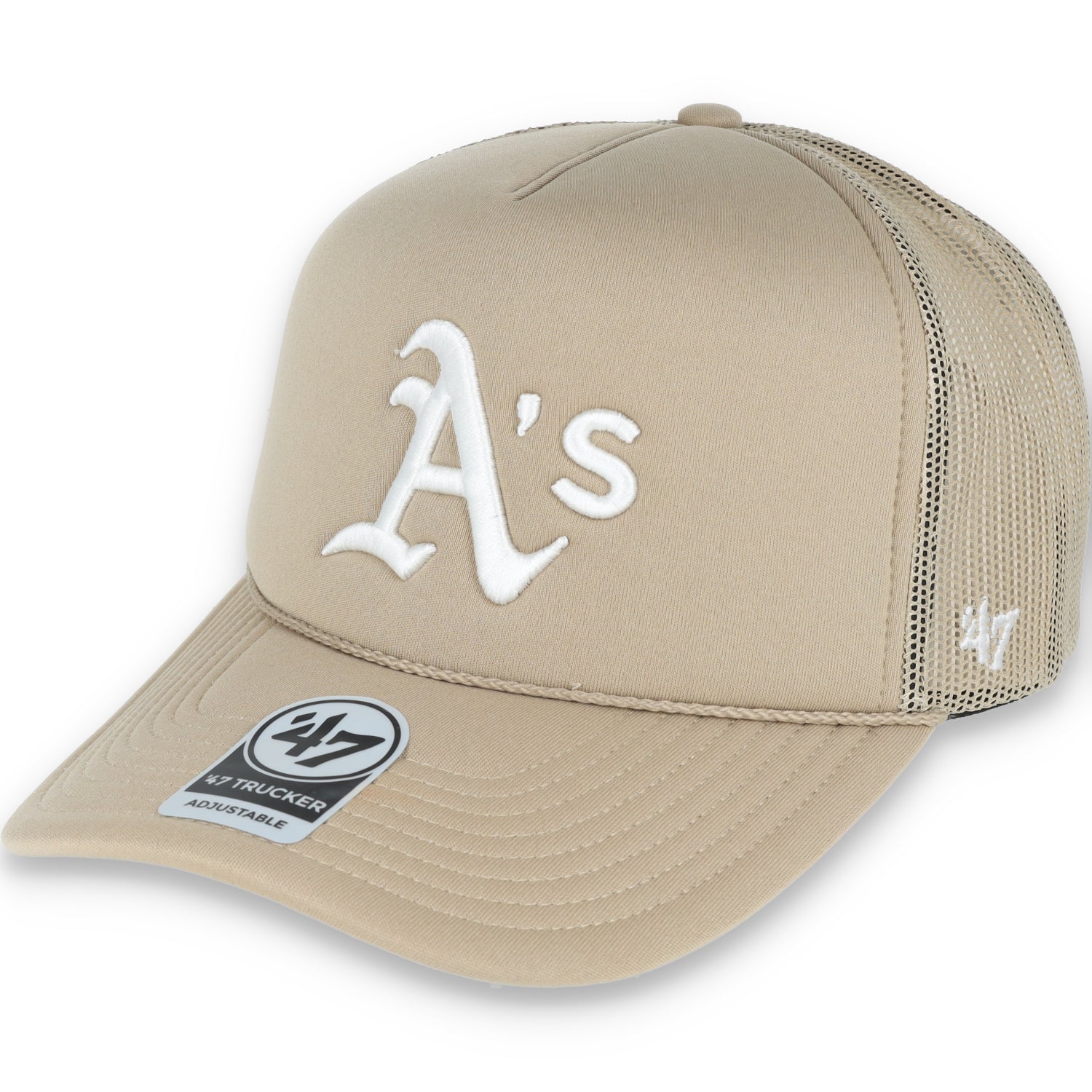 The '47 Trucker has a comfortable mid-crown, a curved visor, and an adjustable plastic snapback. The front has a raised embroidery logo. Made from garment washed cotton twill and hard mesh.