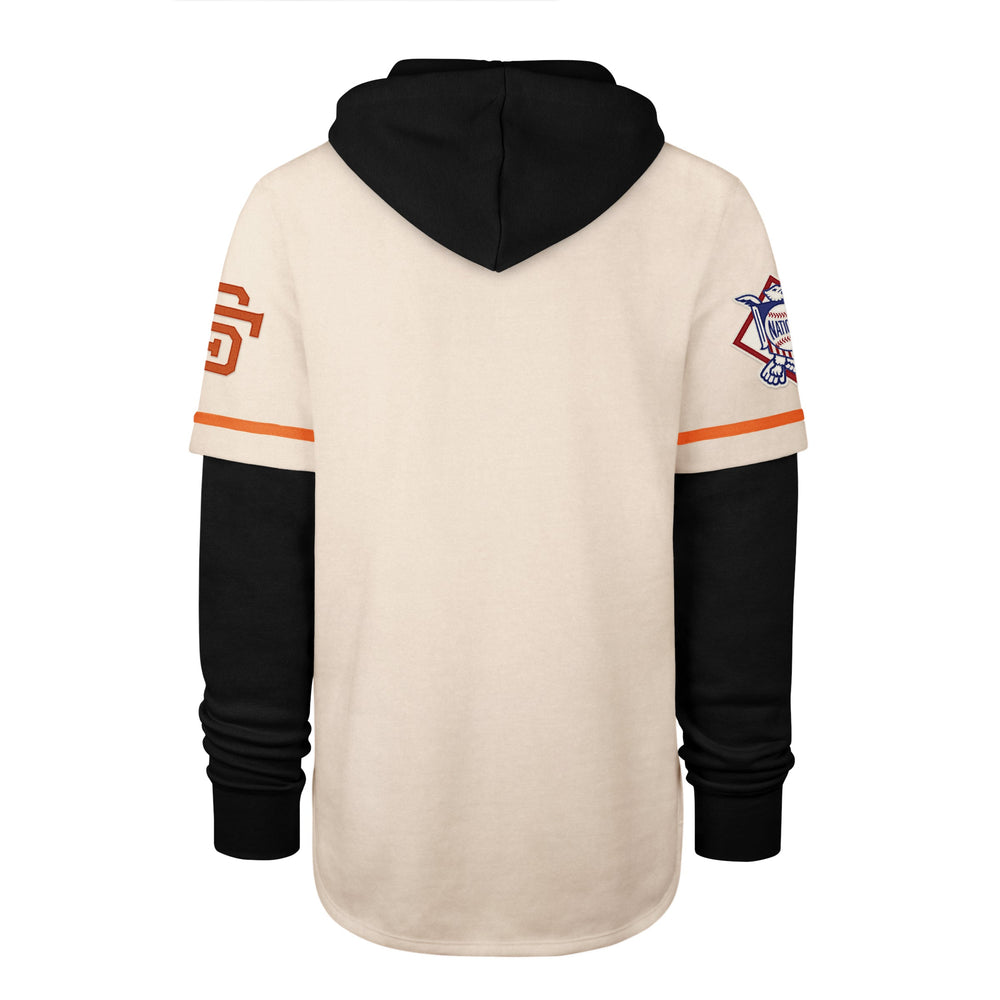**Runs big. Recommend going a size down.** The Trifecta '47 Shortstop Pullover is made from midweight fleece with a soft, brushed interior. It features contrast sleeves and hood for a layered look. This uniform inspired silhouette has twill appliques across the chest featuring official wordmarks, team logos on the left sleeve, and an AL or NL logo on the right sleeve. 80% cotton, 20% polyester. - 80% Cotton, 20% Polyester- Layered Look- Twill Appliques- Imported