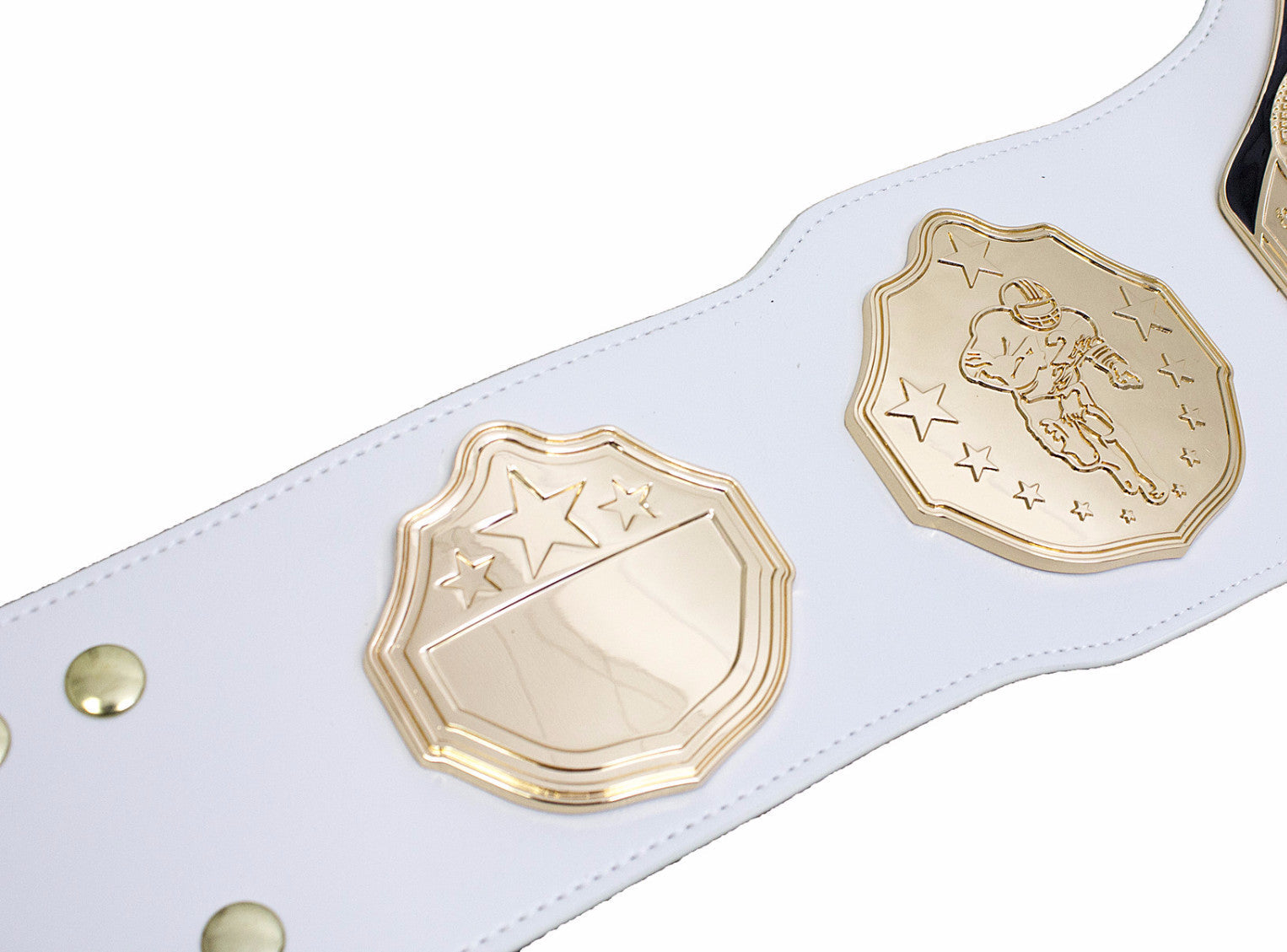 Box of 5 High-Step style fantasy football belts. Comes out to $89 each and retails for $129-$149. End plates have room for engraving with rotary engraver or laser engraveable adhesives that you can custom fit. Choose black or white strap with gold or silver plates.