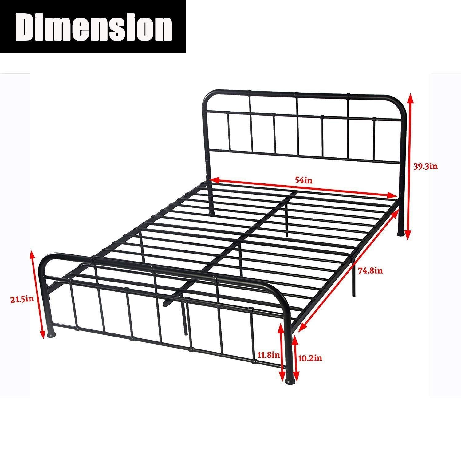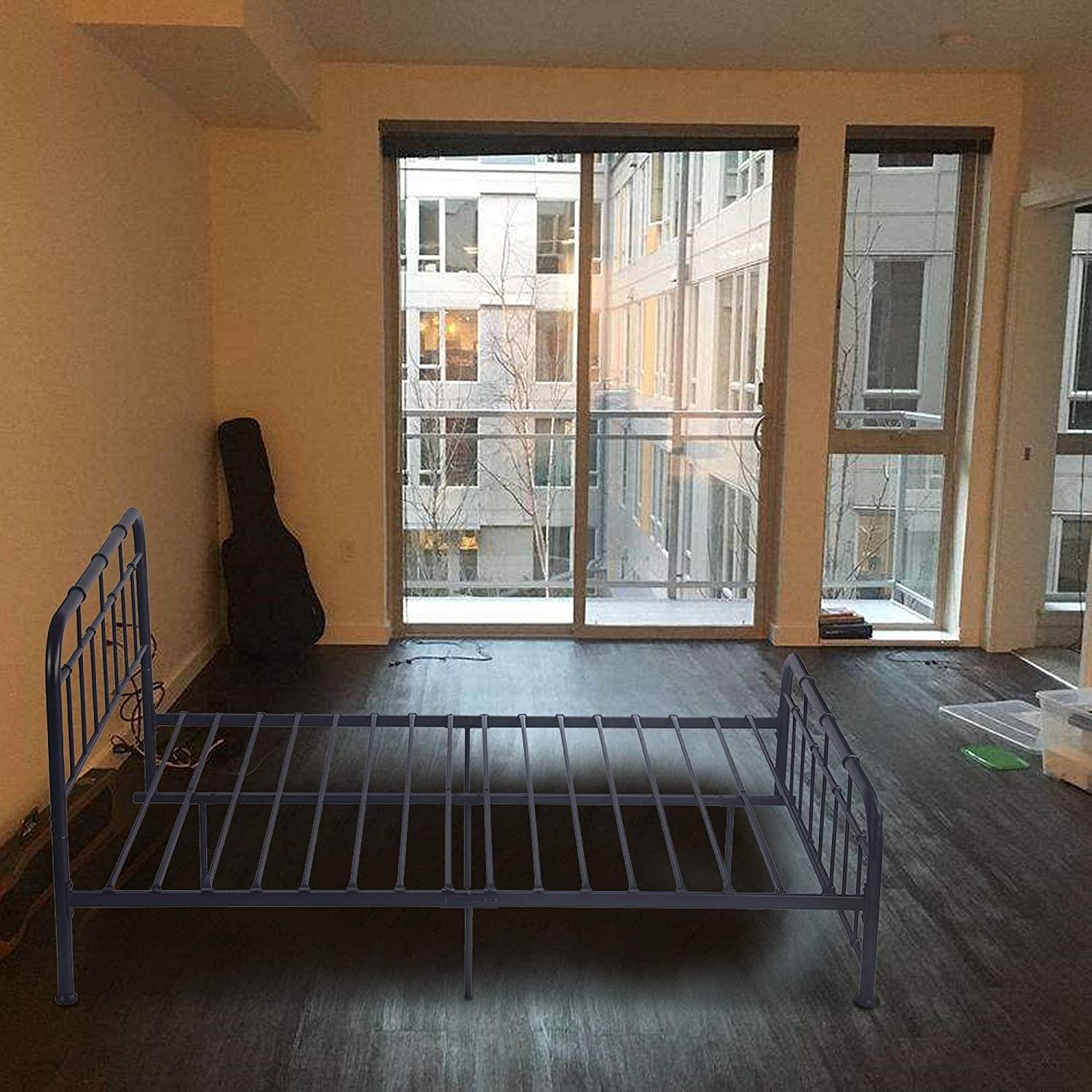 Are you still searching for a sturdy bed frame? The stylish metal bed frame will be your ideal choice! Modern design bed frame with metal headboard and footboard creates a sweet night sleep for you. Iron slat support provides structure and silence. 12 inch under-bed space offers sufficient place for storage. NO box spring needed for convenience. Don’t hesitate to take it home and add a unique charm to your bedroom!