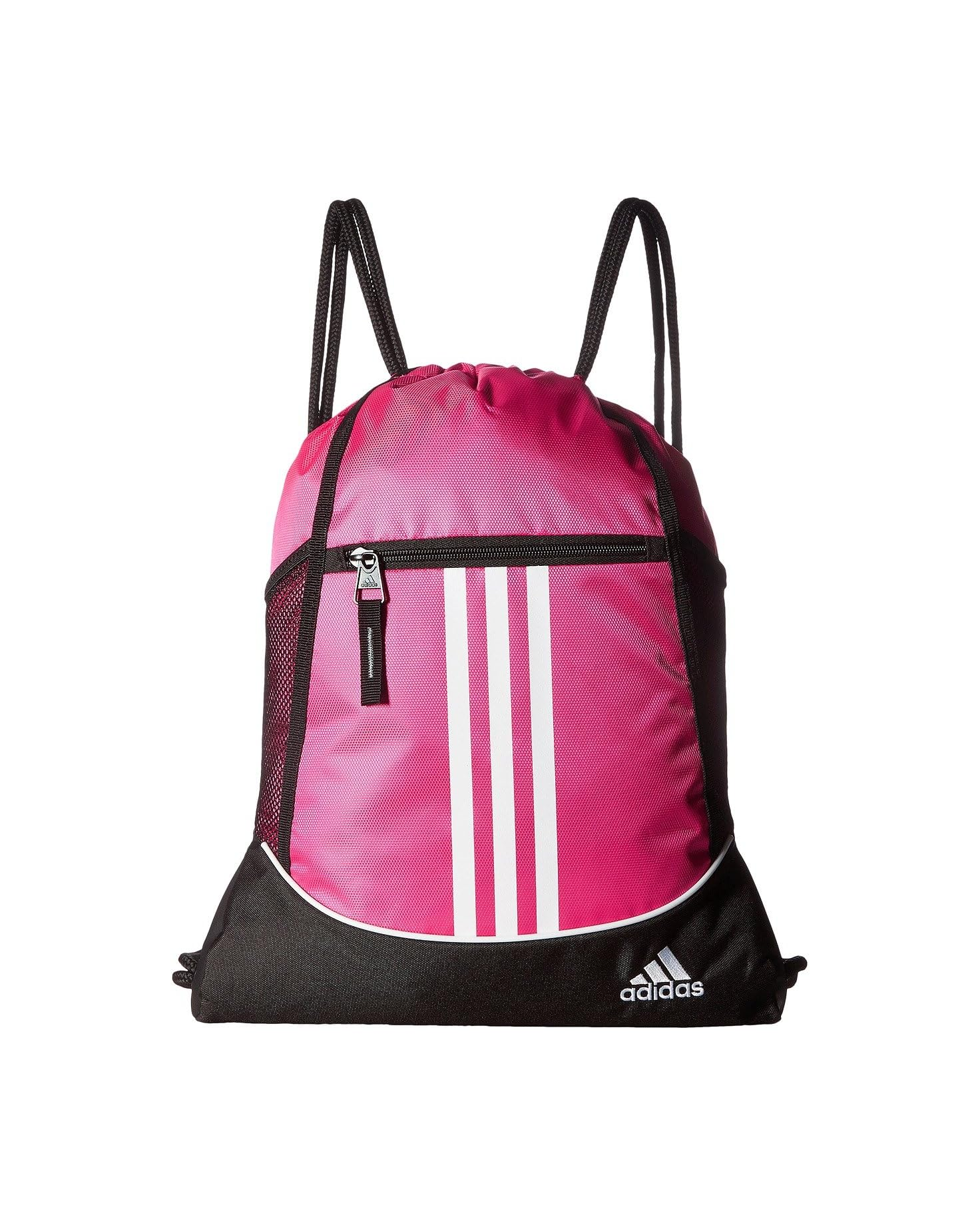 The Adidas Alliance II Sackpack Team Shock Pink is a stylish and practical accessory for any athlete. Its spacious main compartment and adjustable drawcord straps make it easy to carry and store your supplies. The fabric is durable and lightweight for added convenience. Perfect for any sports team, this shock-pink bag stands out and has a timeless style.