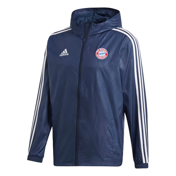 This FC Bayern windbreaker gives you a light layer to pull on when the temperature drops. Taking cues from the home uniform, it's designed with subtle diamond embossing. The jacket is made of durable ripstop, with zip pockets and a fully lined hood.