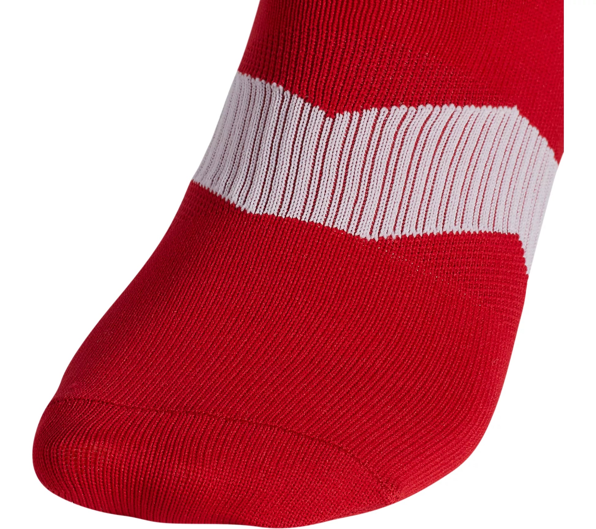 Adidas Metro 6 OTC Soccer Sock - Red offers a degree of performance, comfort and style unparalleled by the competition. Made from polyester, spandex and elastane, these socks feature a cushioned heel pocket and engineered arch support to provide maximum comfort and energy during play. Elevate your game with these dynamic and stylish socks.