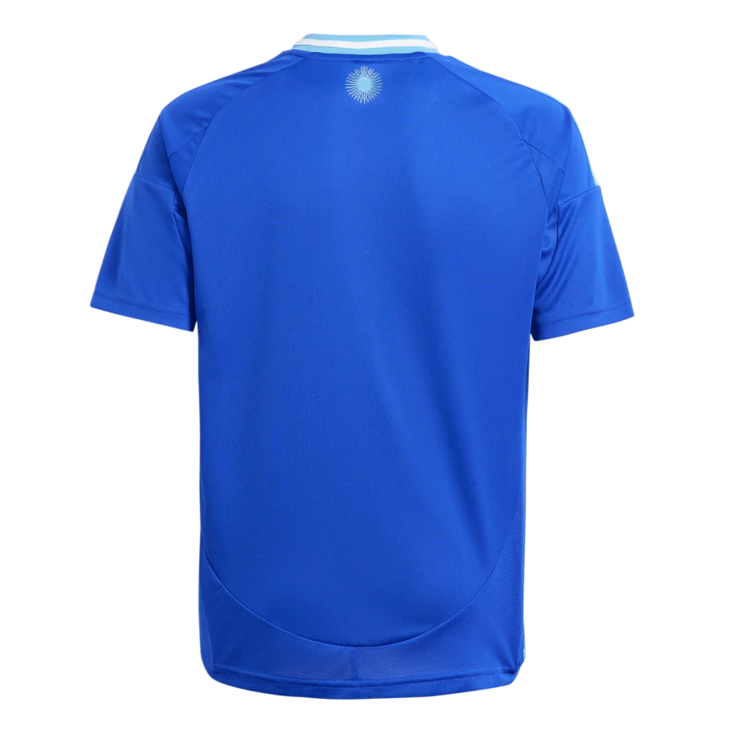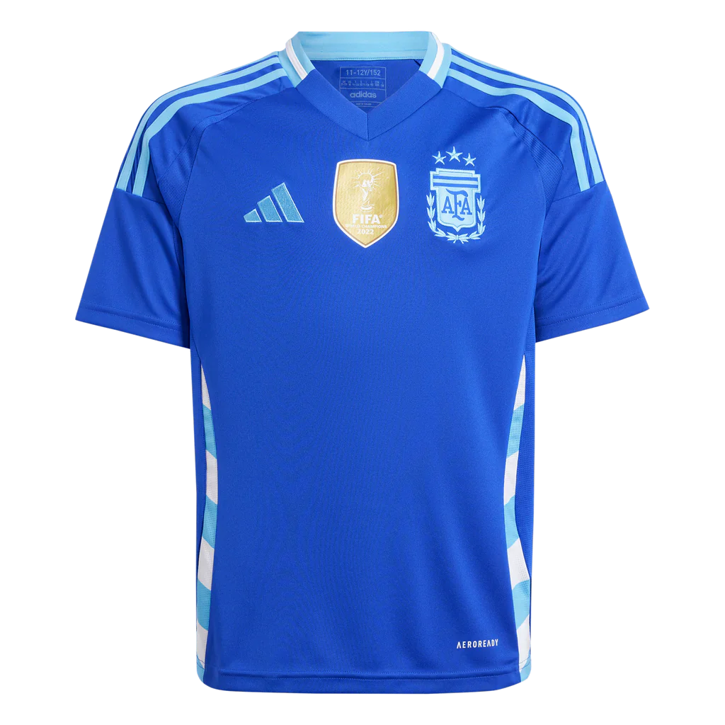 Rock Argentina's colors in a juniors' adidas away jersey inspired by the nation's music scene. Showing off metallic elements and an eye-catching shade of blue, this soccer shirt is designed to keep fans comfortable thanks to its mesh inserts and moisture-managing AEROREADY. A woven team crest takes center stage while you sing for your team. This product is made with 100% recycled materials. By reusing materials that have already been created, we help to reduce waste and our reliance on finite resources and reduce the footprint of the products we make.