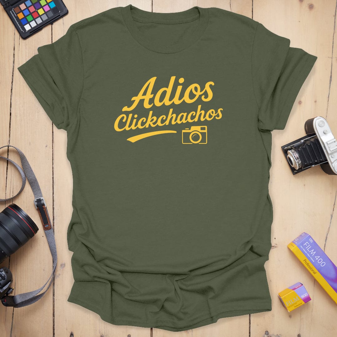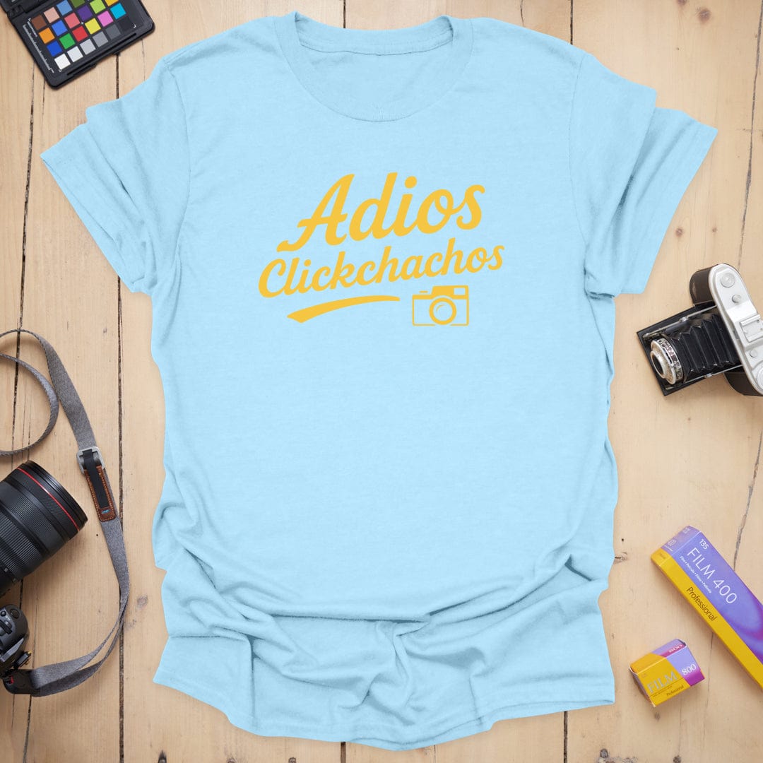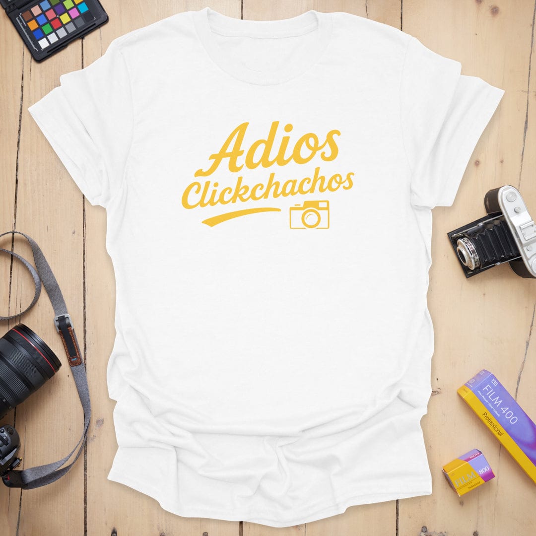 Say cheese and peace out ✌️ The "Adios Clickchachos" tee is your go-to farewell fit for when the shoot wraps and the light’s gone golden. With a bold script and a cheeky camera icon, this shirt says exactly what you're thinking after a long day behind the lens. Soft, comfy, and ready for your next photo adventure (or exit). 📸👋