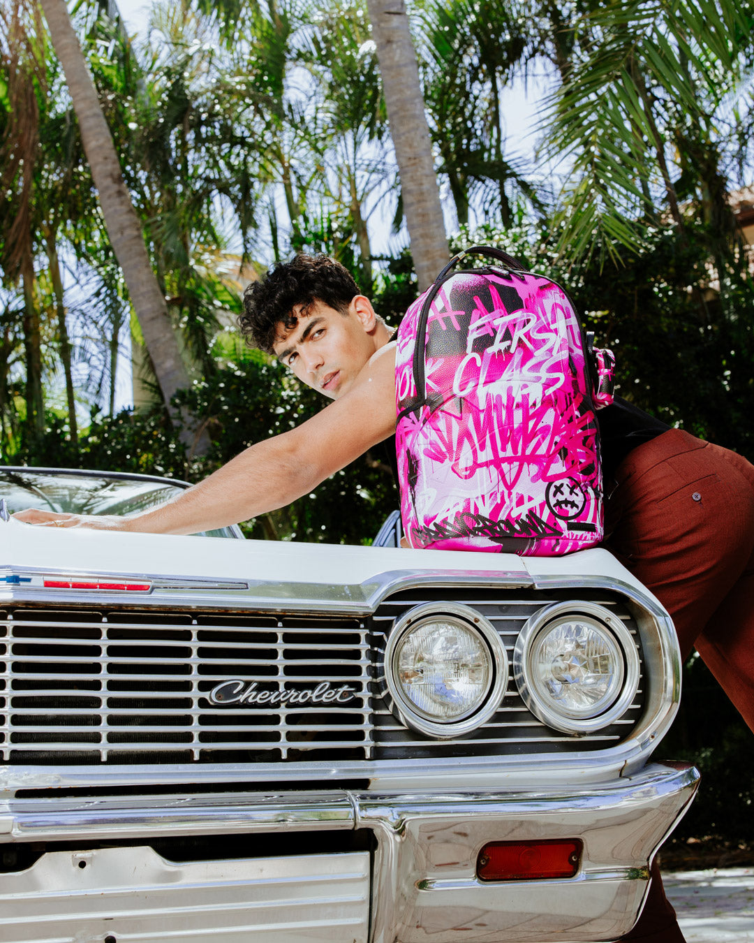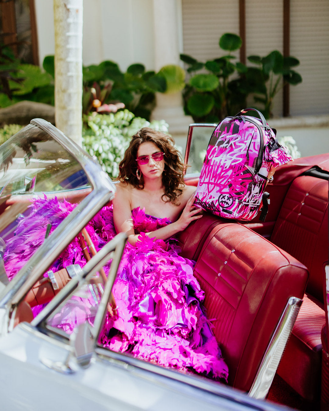 Dimensions: 18" x 6" x 11.5" • Front zipper pocket • Side pockets • Zippered Stash pocket • Separate velour sunglass compartment • Ergonomic mesh back padding • Adjustable Straps for custom sizing • Gold zippers with metal hardware • Metal "Sprayground Authentic" badge • Slide through back sleeve connects to carry-on luggage to free your hands