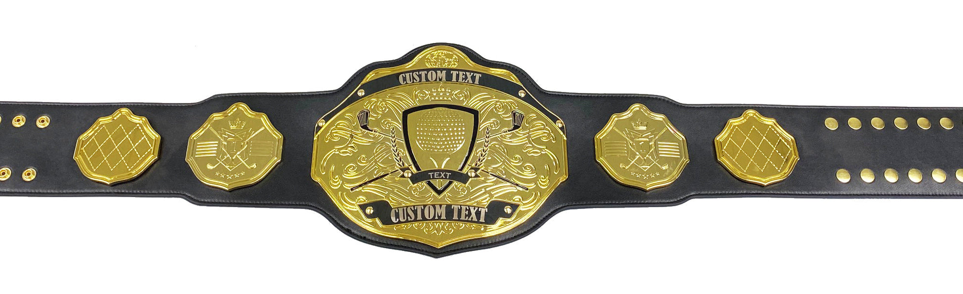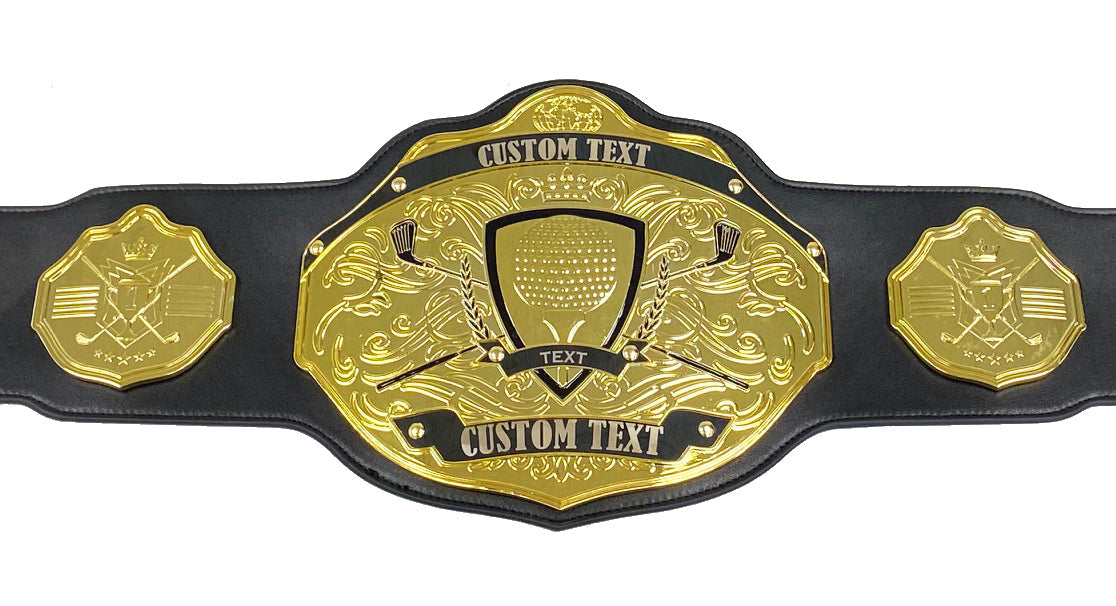 3D Golf Championship Belt! Customizable banners and Optional Side Plates. This belt has thicker and raised 3D texture on the main plate as well as more weight than our traditional custom belts.