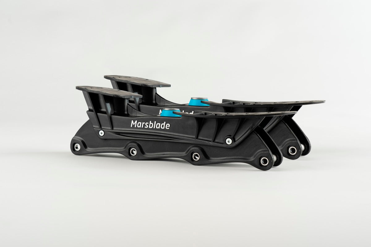 The Marsblade O1 chassis powered by the patented Flow Motion Technology - a unique rocker that replicates the radius shaped ice blade to simulate ice skating. The rocker is also designed to challenge players balance and to activate the core and stabilizer muscles in order to improve on-ice skating performance.