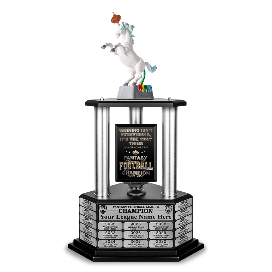 “Unismack” is our most captivating fantasy football trophy topper and self-proclaimed company founder. Some say its mythical powers will rain down on you as you look back at the legendary FFL win that landed this beast on your mantle. However, for some, the fairy-tale ended long ago and a season win was all but fictional. Those poor souls must endure a daily dose of fantastical shame and rainbow defecation from this impressive creature. Some of this trophy's many features include: